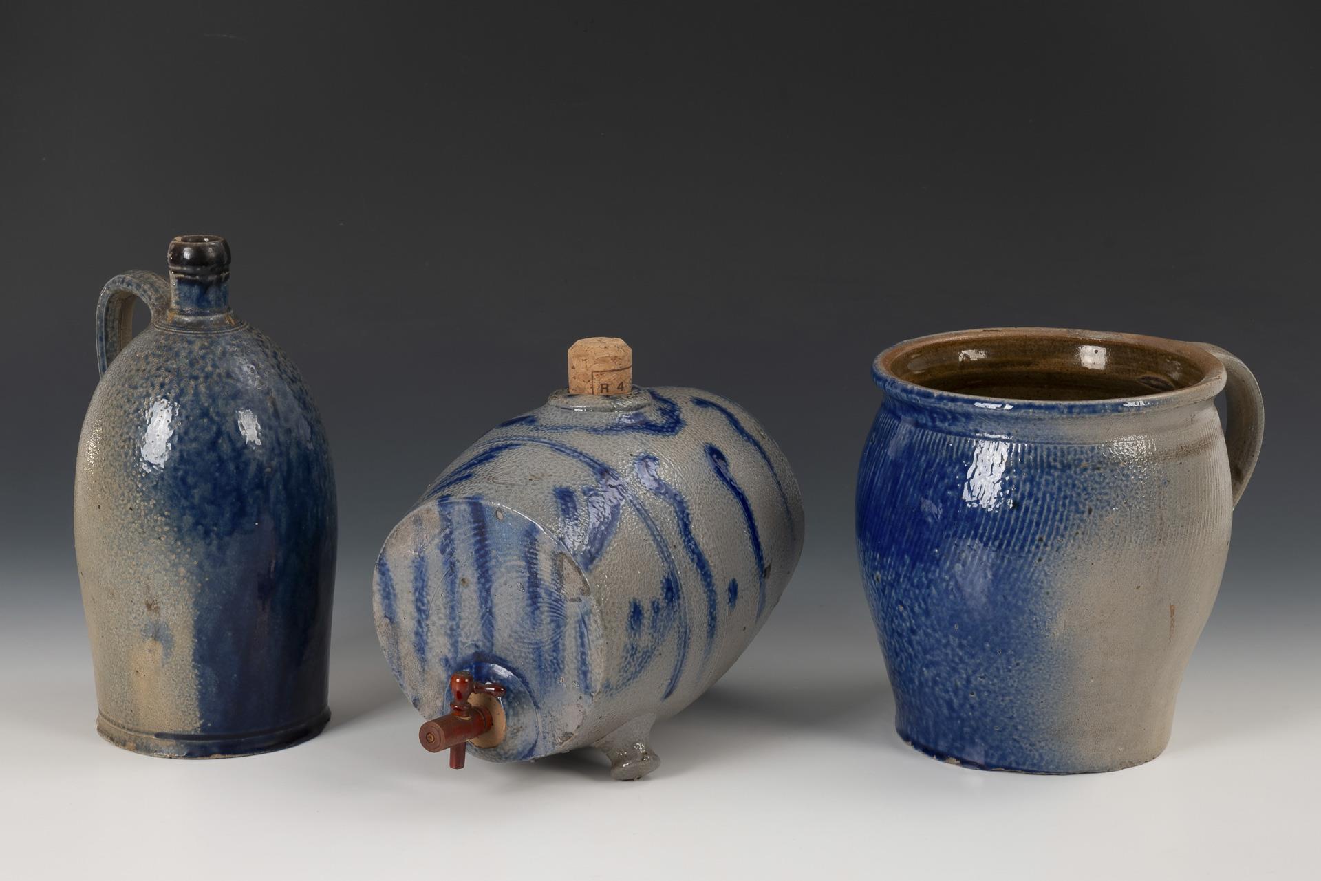 2 Bürgeler Blauschürzengefäße und 1 Westerwälder Fässchen.
