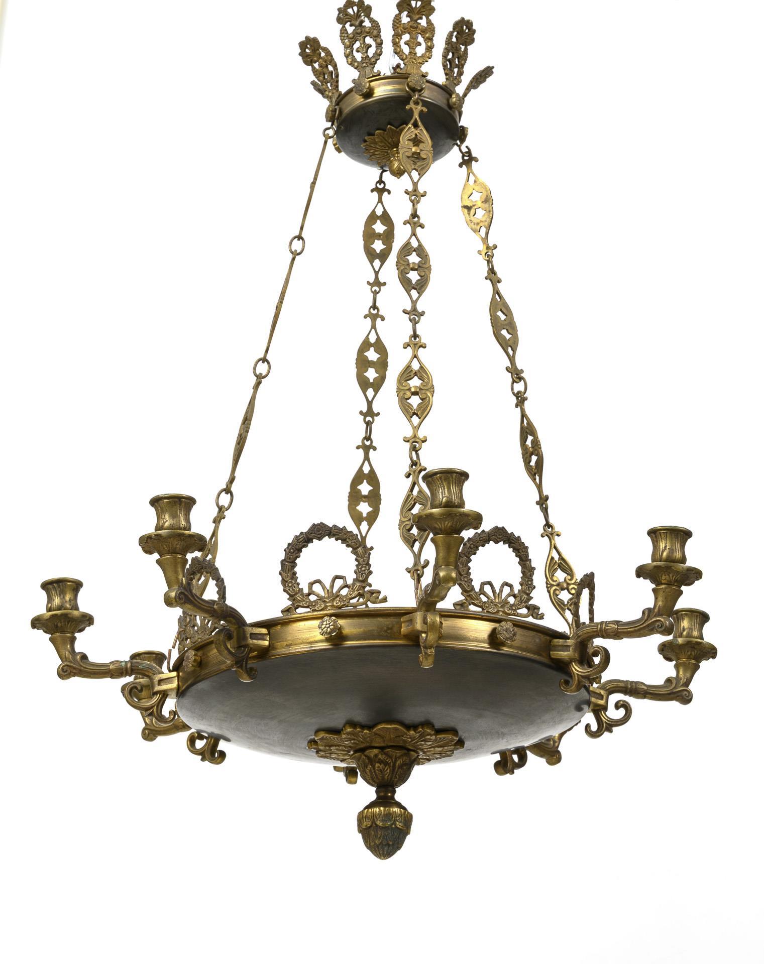 Zentrale Messingschale mit Zapfenabhängung, 8 Volutenarme mit Vasentüllen, 3 Zierketten mit Palmettengliedern, ähnlich der Hauptschale geformter Baldachin mit 8 Bekrönungen in Kranzform. Entfernte Elektrifizierung.