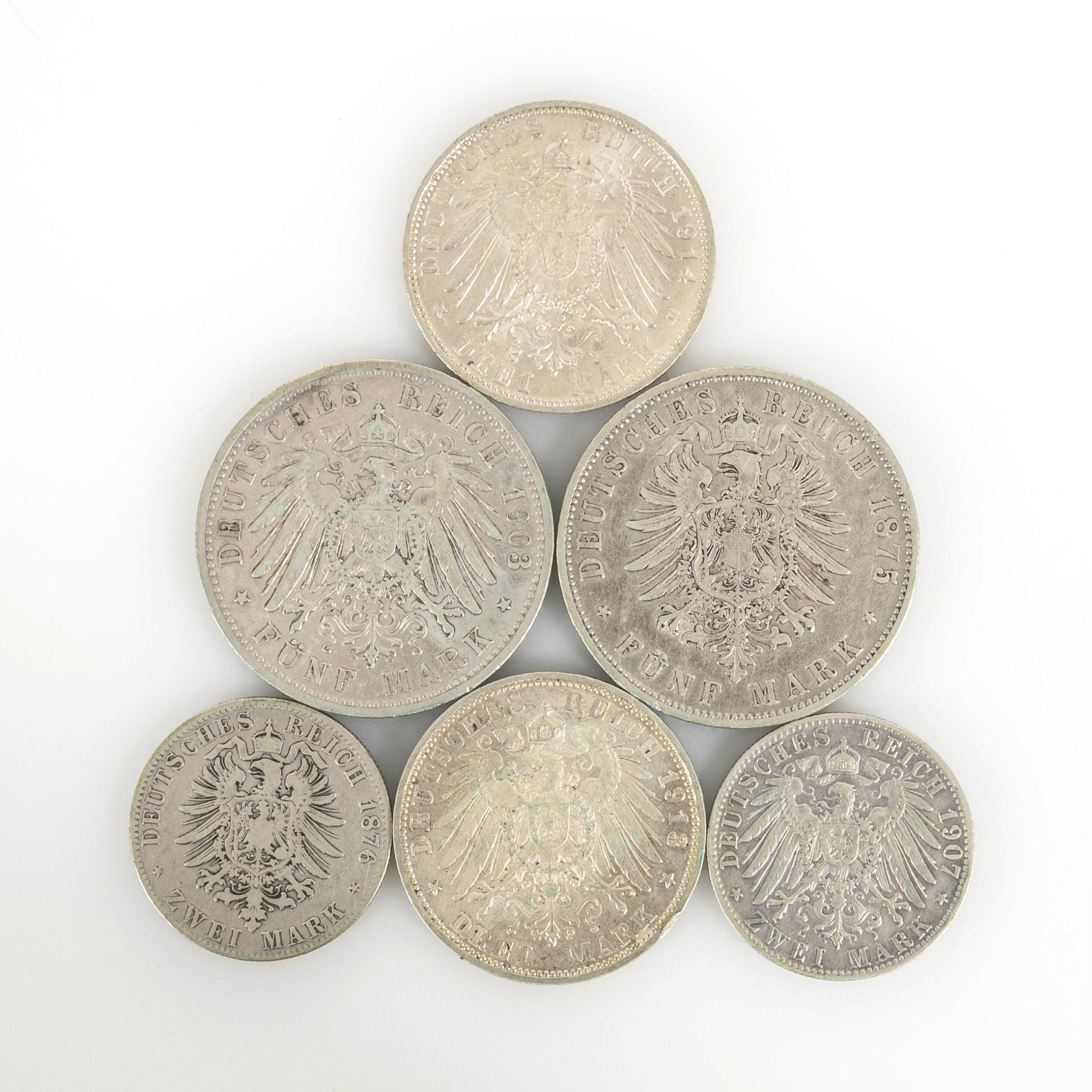 5 Mark 1875 "Ludwig II. Koenig v. Bayern", Münzort D. / ebenso 2 Mark 1876 / 5 Mark 1903 "Otto Koenig von Bayern", Münzort D. / ebenso 3 Mark 1913 / ebenso 2 Mark 1907 / 3 Mark 1914 "Ludwig III Koenig von Bayern", Münzort D. Zustand: sehr schön.