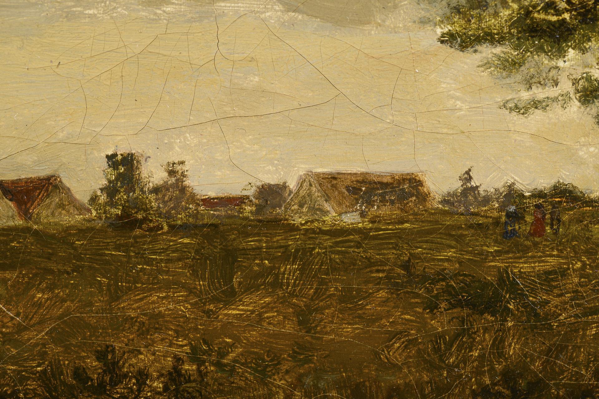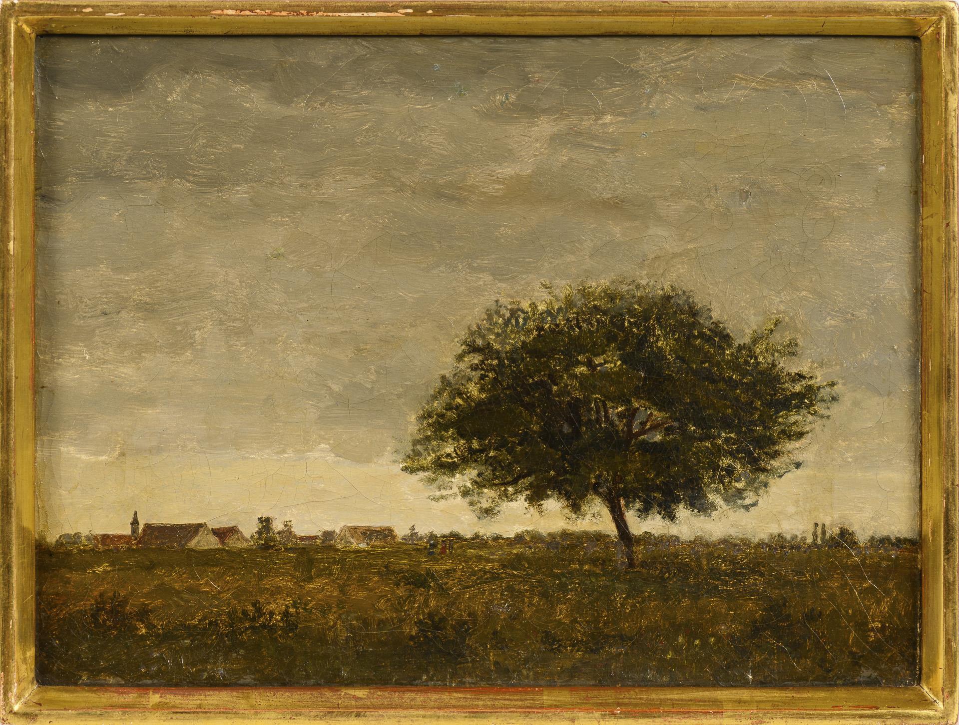 Weite flache Gegend mit einem Dorf am Horizont unter bewölktem Himmel. Kleine restaurierte Stellen.