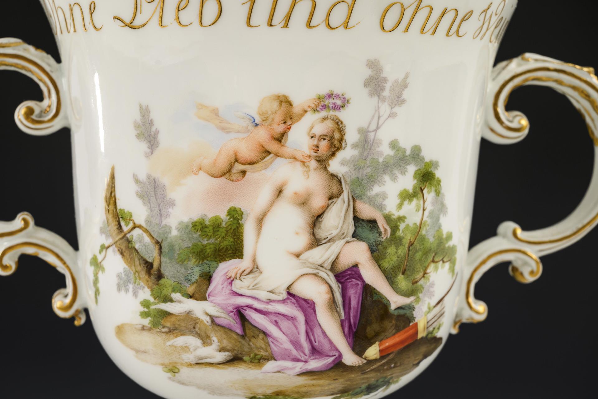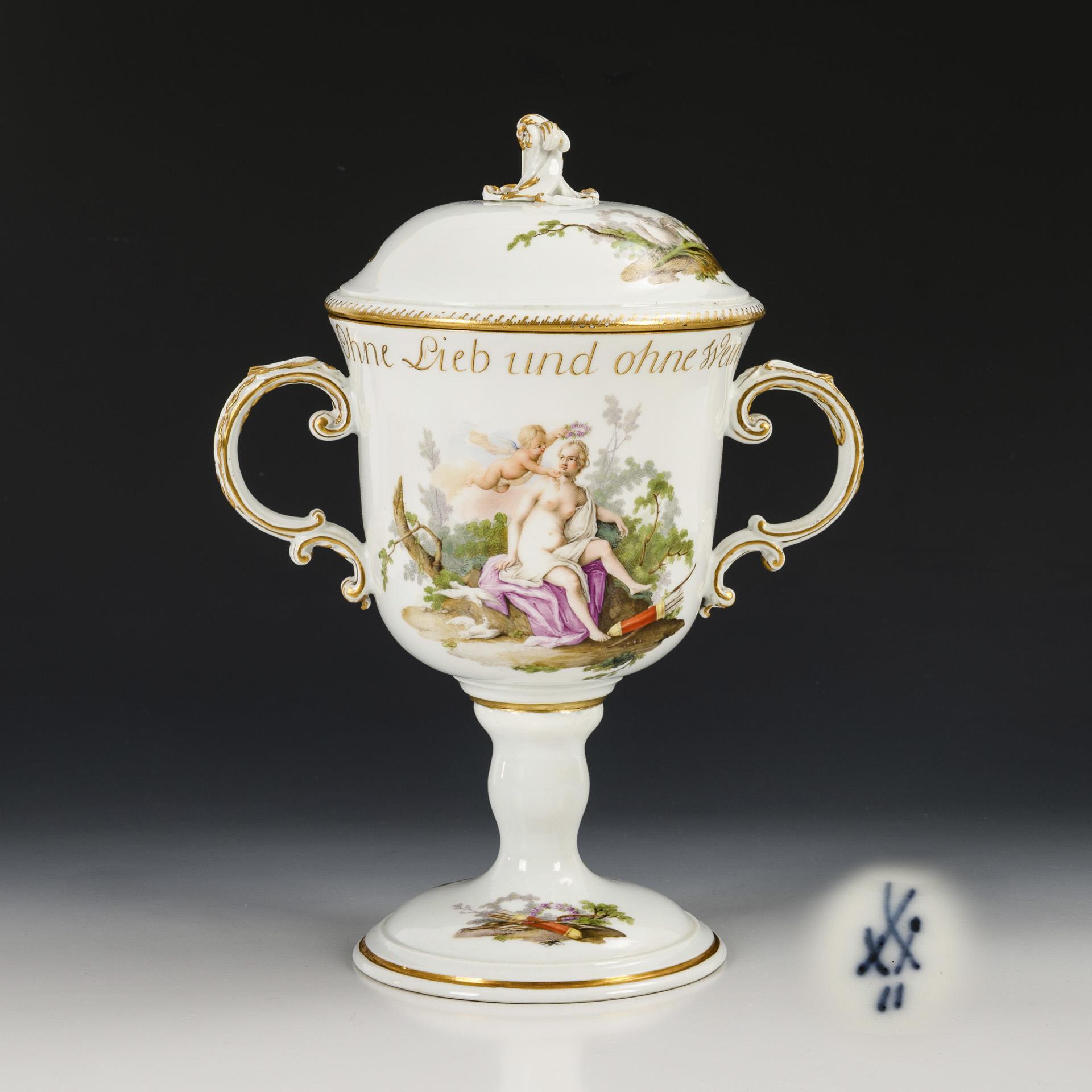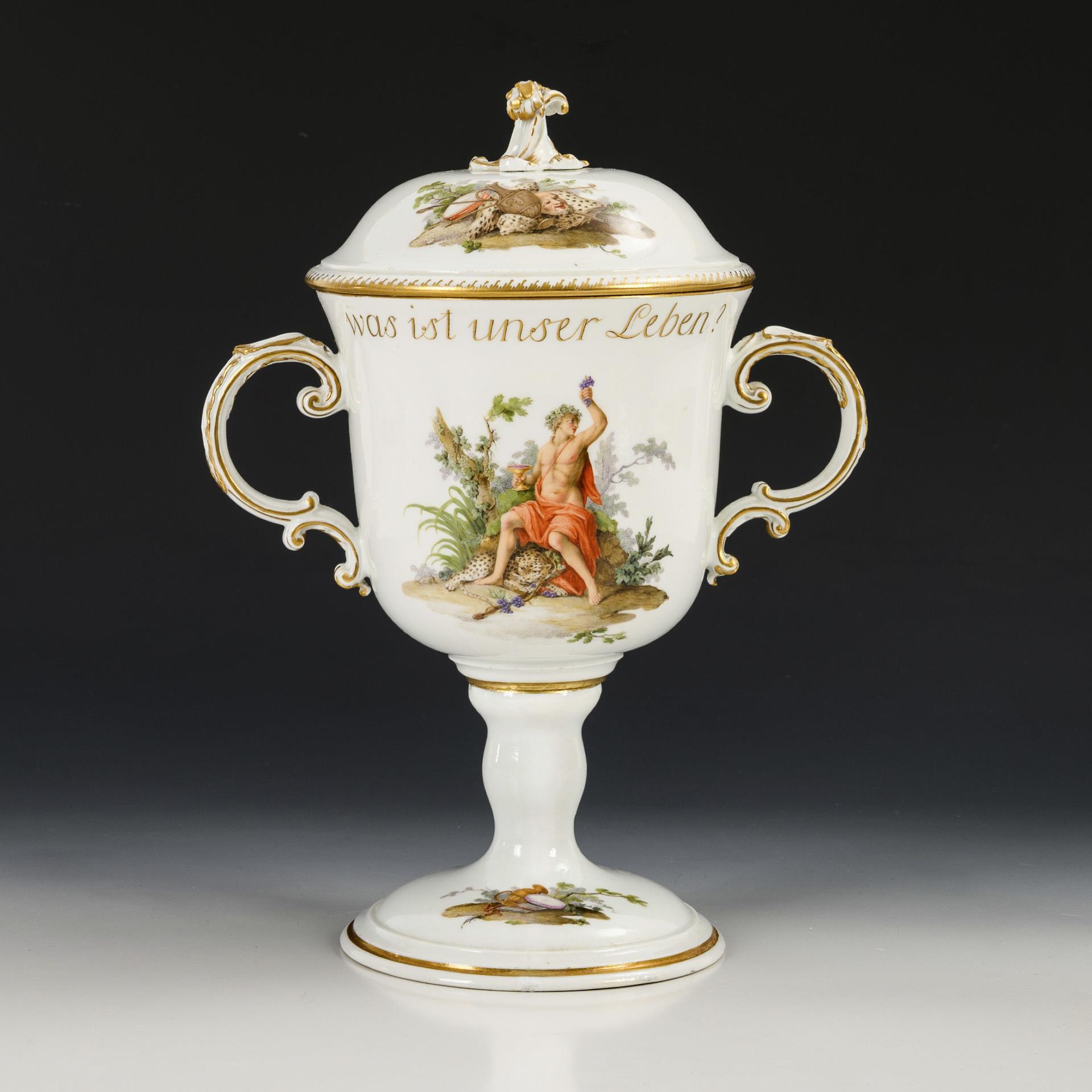 Glockenkorpus mit zwei Rocaillehenkeln, Schaft, Rundfuß und Rocailleknaufdeckel. Auf dem Korpus die Darstellung der Venus mit Amor bzw. des Bacchus mit Leopard, am Rand die Umschrift "Ohne Lieb und ohne Wein, was ist unser Leben?", auf Deckel und Fuß Symbolarrangements bzw. 1x ein Taubenpärchen. Korpusrand, Fuß und Schaft restauriert.