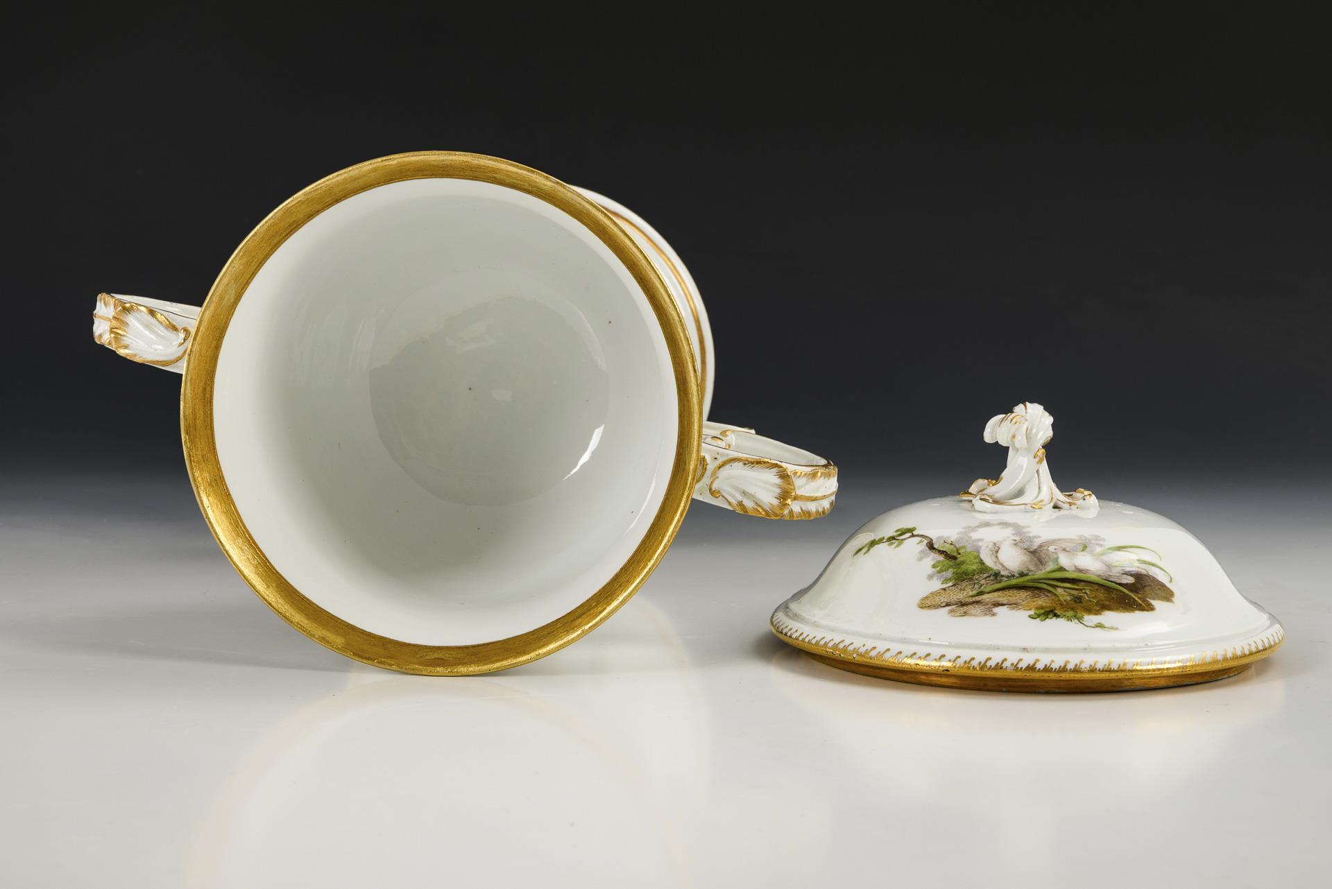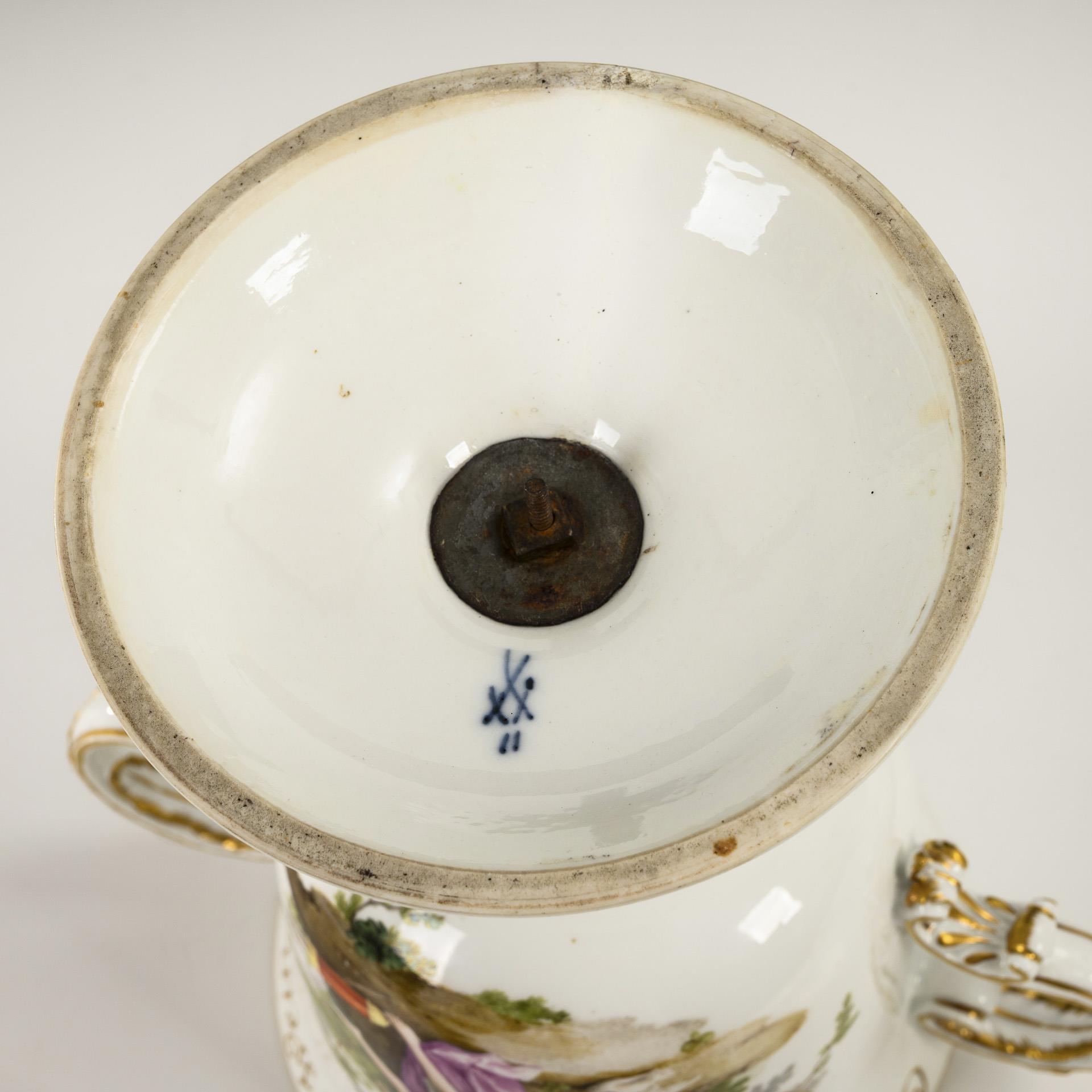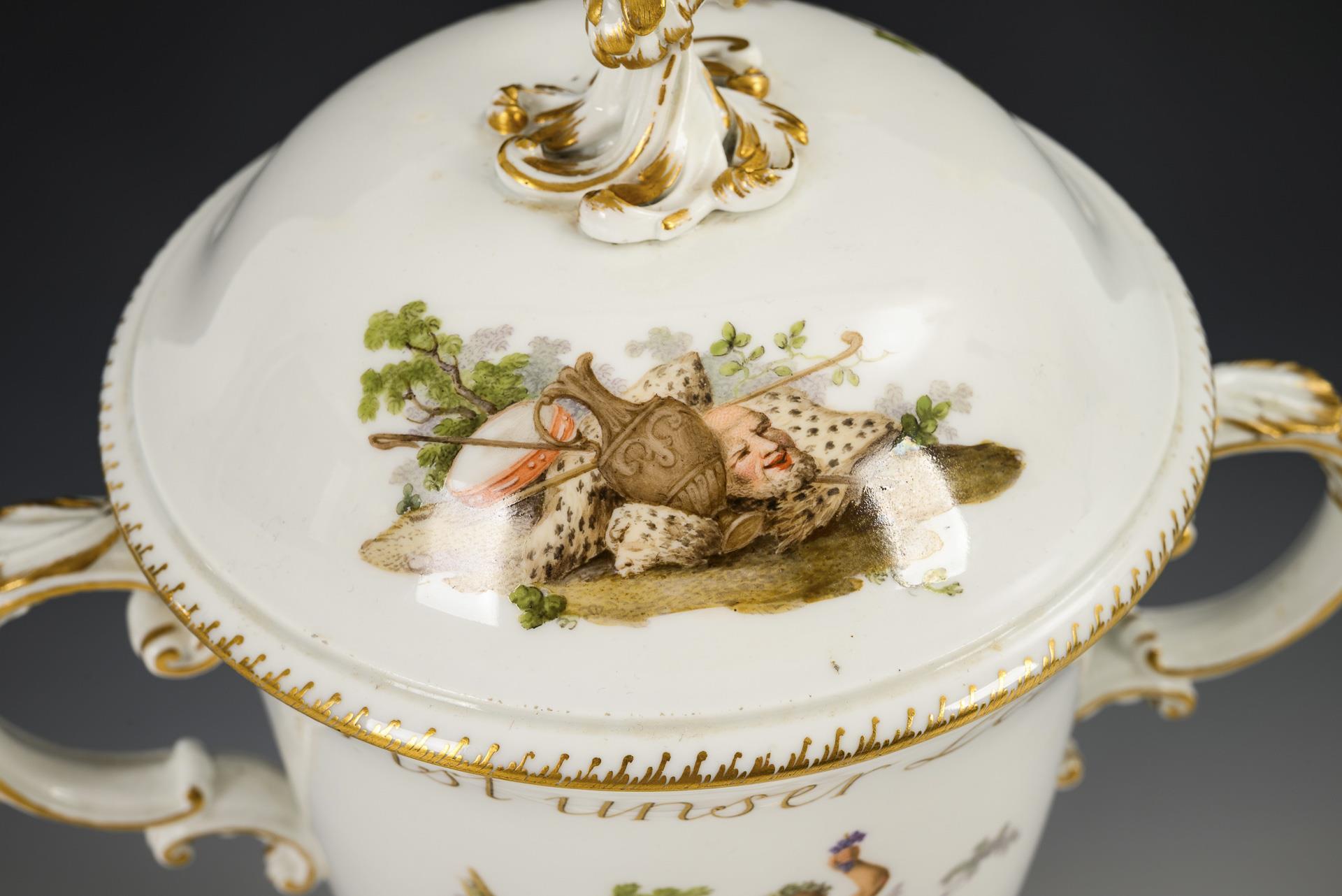 Glockenkorpus mit zwei Rocaillehenkeln, Schaft, Rundfuß und Rocailleknaufdeckel. Auf dem Korpus die Darstellung der Venus mit Amor bzw. des Bacchus mit Leopard, am Rand die Umschrift "Ohne Lieb und ohne Wein, was ist unser Leben?", auf Deckel und Fuß Symbolarrangements bzw. 1x ein Taubenpärchen. Korpusrand, Fuß und Schaft restauriert.