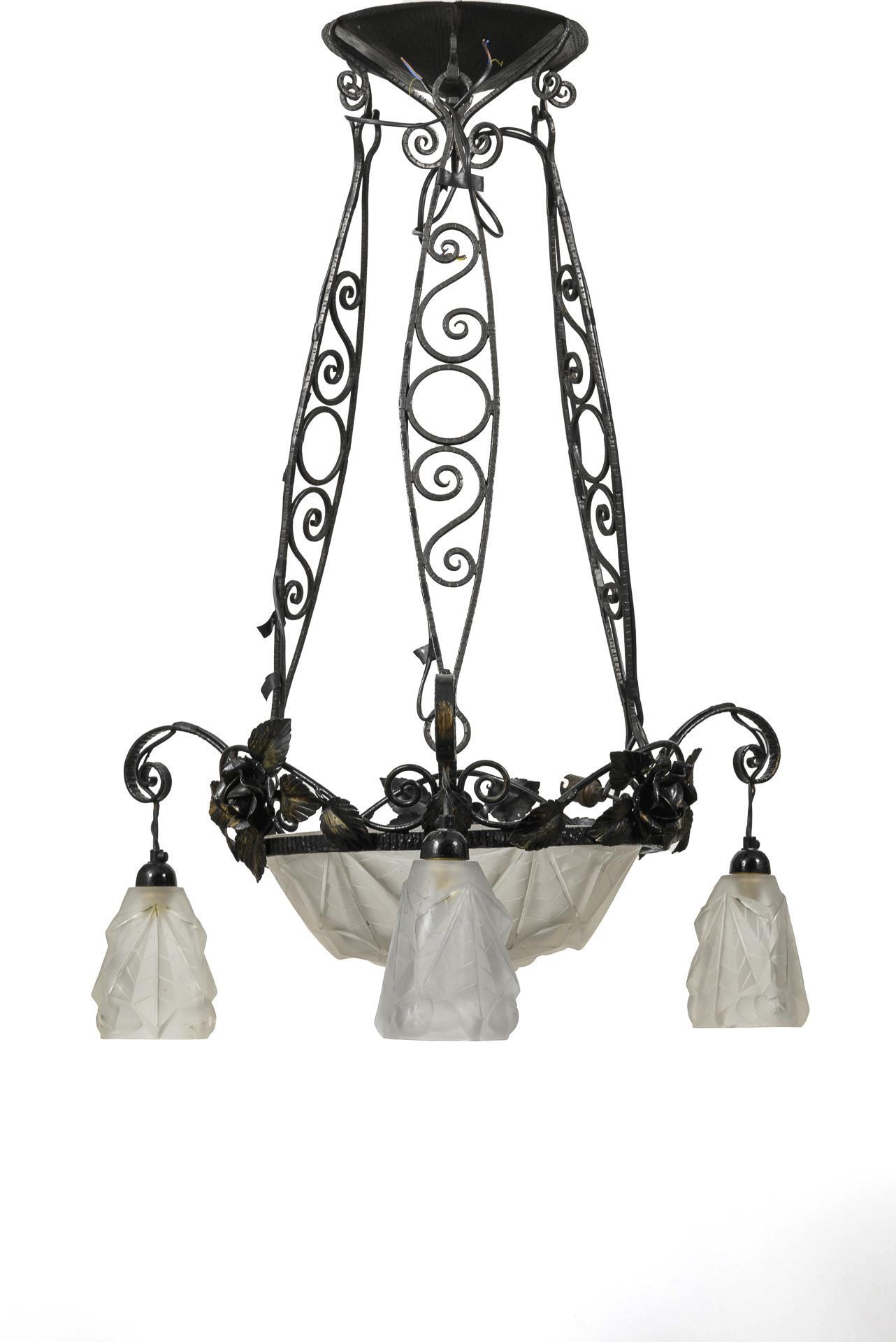 Am Baldachin 3 sphärische Streben mit Volutenfüllungen, Schalenkranz mit geschmiedeten Rosen, 1 Fassung in der Glasschale, 3 Volutenarme für die Glasglocken mit abstrakt geometrischem Relief. Chips an den Gläsern, Funktion nicht geprüft.