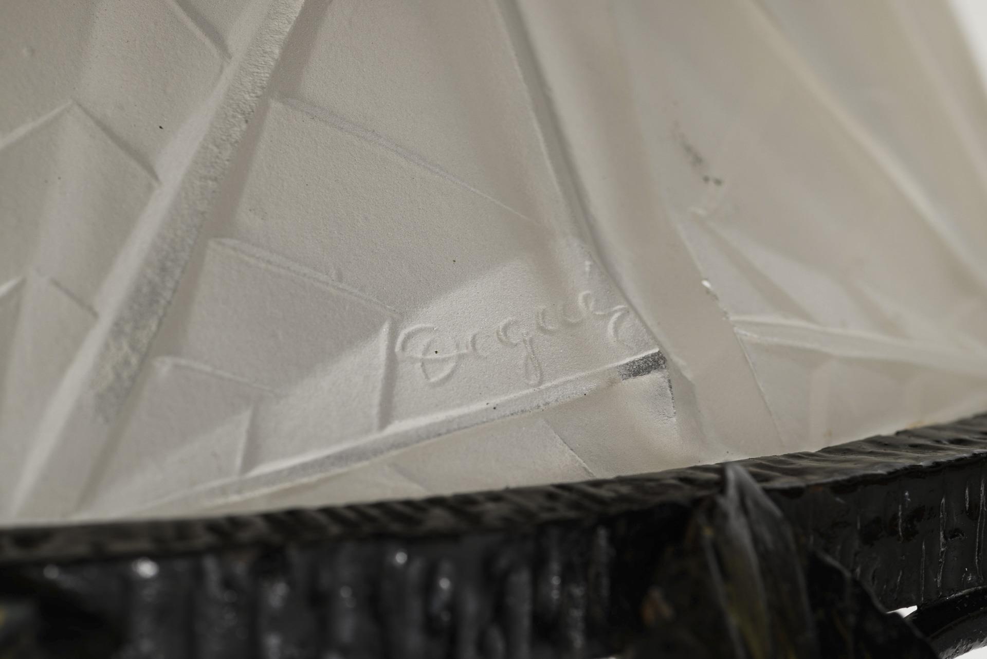 Schmiedeeisen schwarz lackiert, farbloses Formglas satiniert, Elektrifizierung mit Bajonettfassungen. H 89 cm, Ø Glasschale 35 cm. ca. 20 kg.