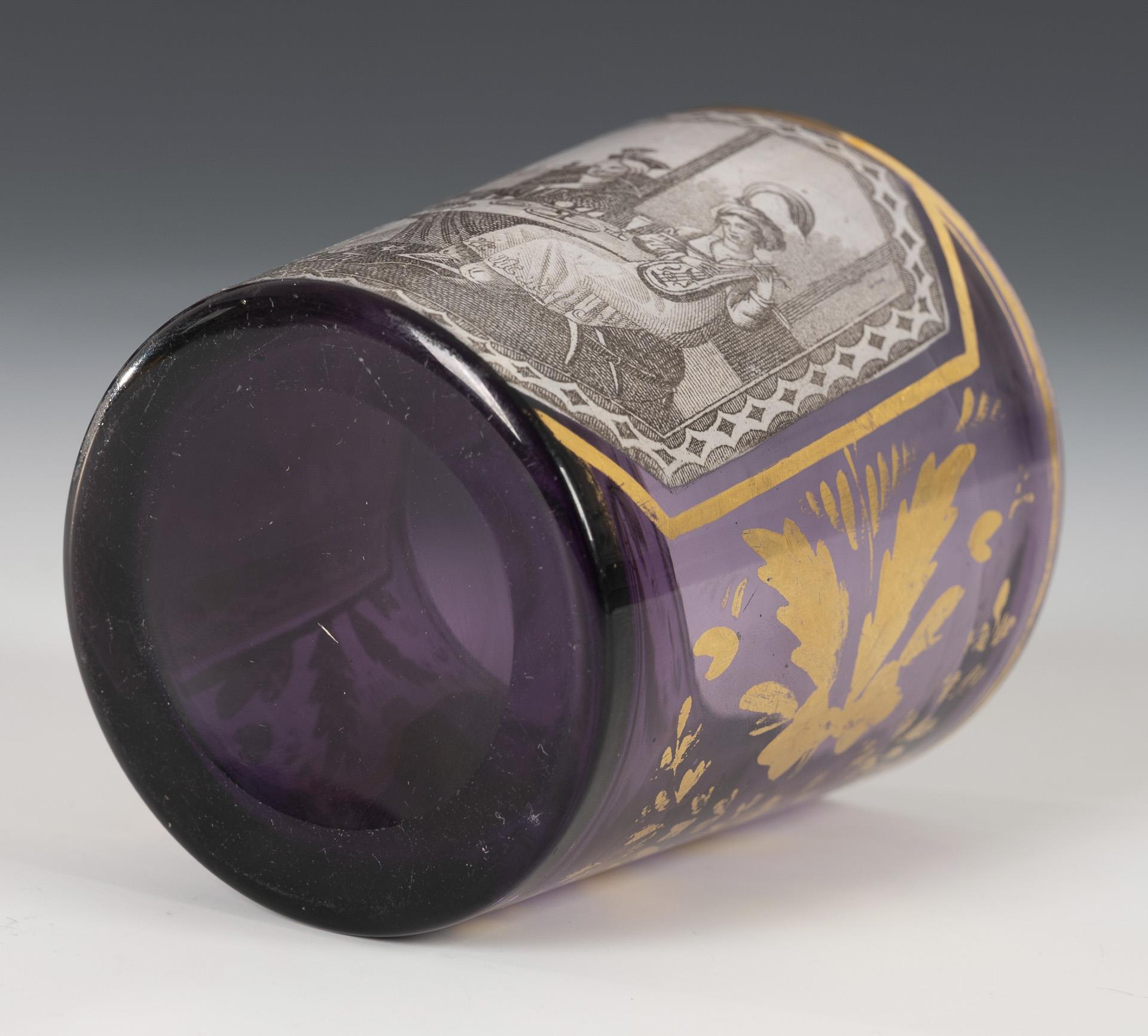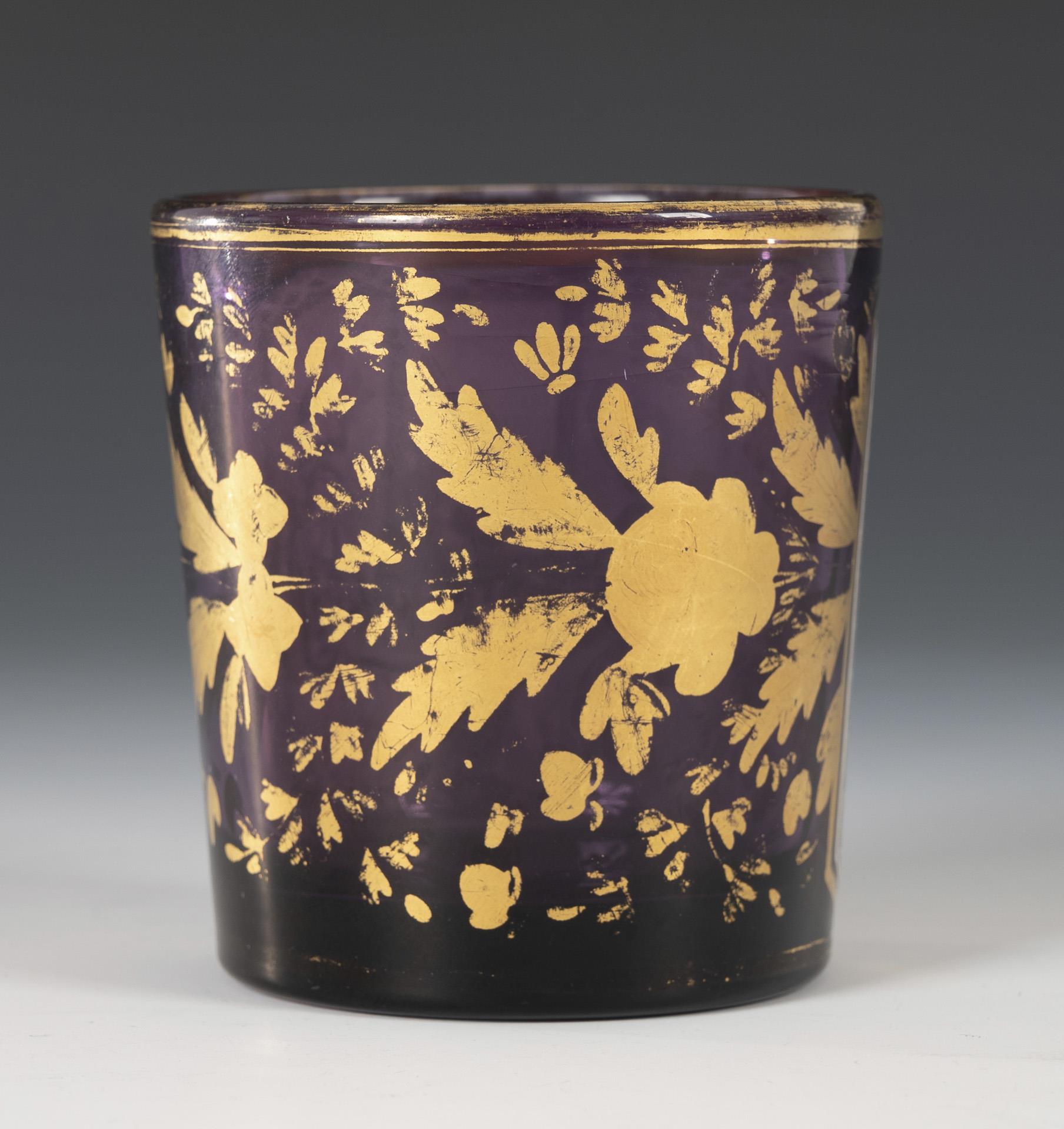 Zylinderbecher aus violettem Glas; ausgekugelter Abriss. Schauseitig eine Umdruckdarstellung auf weißem Emailfond: Tischgesellschaft im orientalischen Stil mit zwei Damen, Herr und Diener, verso florale Goldmalerei. Partieller Goldabrieb.