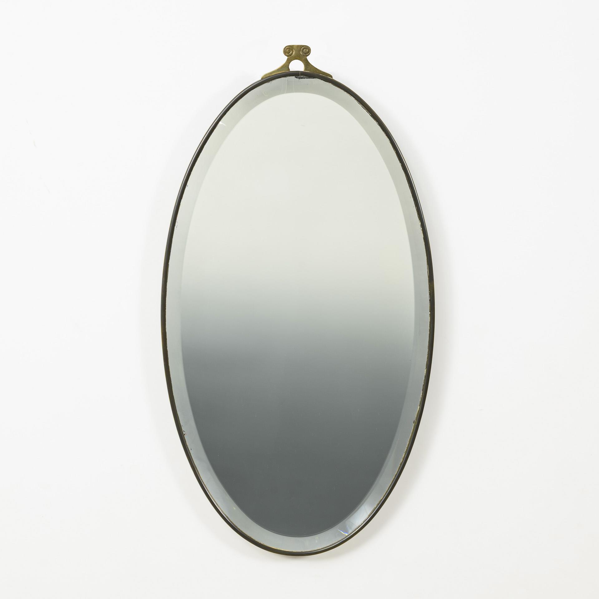 Ovales, facettiertes Spiegelglas, eingefasst in einem dezenten Metallrahmen mit bekrönendem Messingornament, rückseitige Bleiabdeckung.