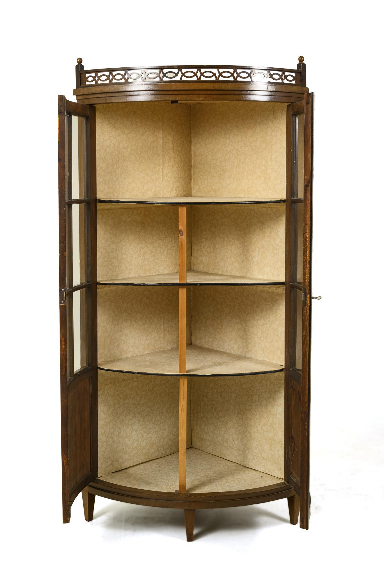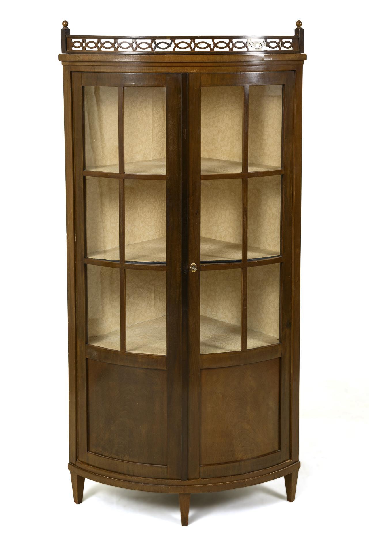 Gerundeter, 2-türig gesprosst verglaster Korpus mit 3 Schaufächern, ornamental durchbrochenem Emporengeländer und kassettiertem Sockelbereich mit 1 Staufach, auf 4 konischen Füßen. Ovaler Schlüssellochbeschlag aus Messing. Innen 4 Fächer mit heller Tapetenauskleidung und provisorisch eingesetzten Stützleisten für die Böden. Alters- und Gebrauchsspuren, Geländer mit gebrochenen oder teils fehlenden Elementen, partiell Furnierdefekte.