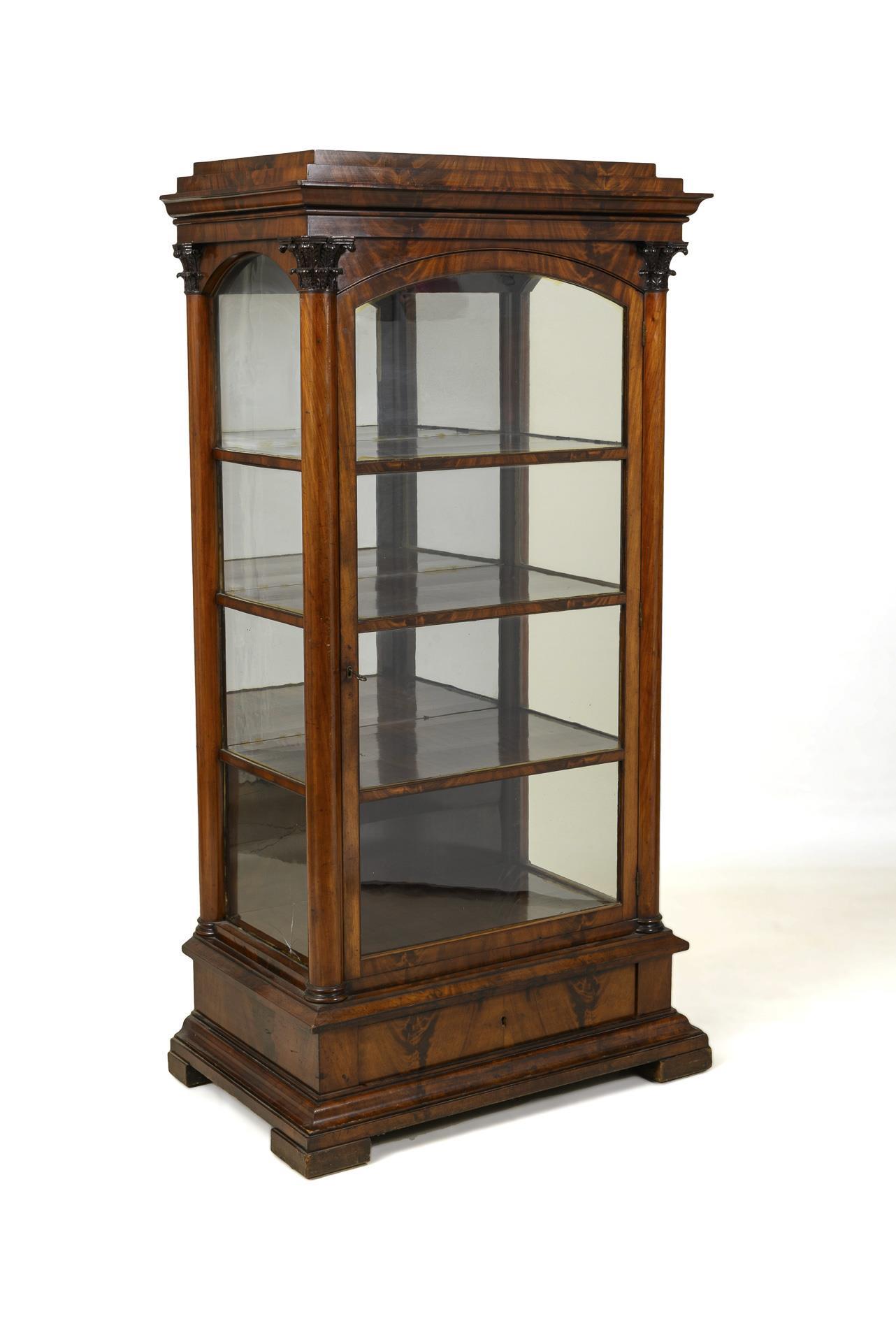 3-seitig verglaster, 1-türiger Korpus mit Sockelschub, auf 4 flachen Klotzfüßen. Getrepptes Gesims, bogensegmentierte und gesprosste Verglasung, Dreiviertelsäulen mit Akanthusblättern. Innen 4 Ablagefächer und verspiegelte Rückwand. Schlüssellocheinlage aus Messing, im Sockel fehlend. Alters- und Gebrauchsspuren, 1 Seitenglas gesprungen, Schlösser defekt bzw. nicht schließend.