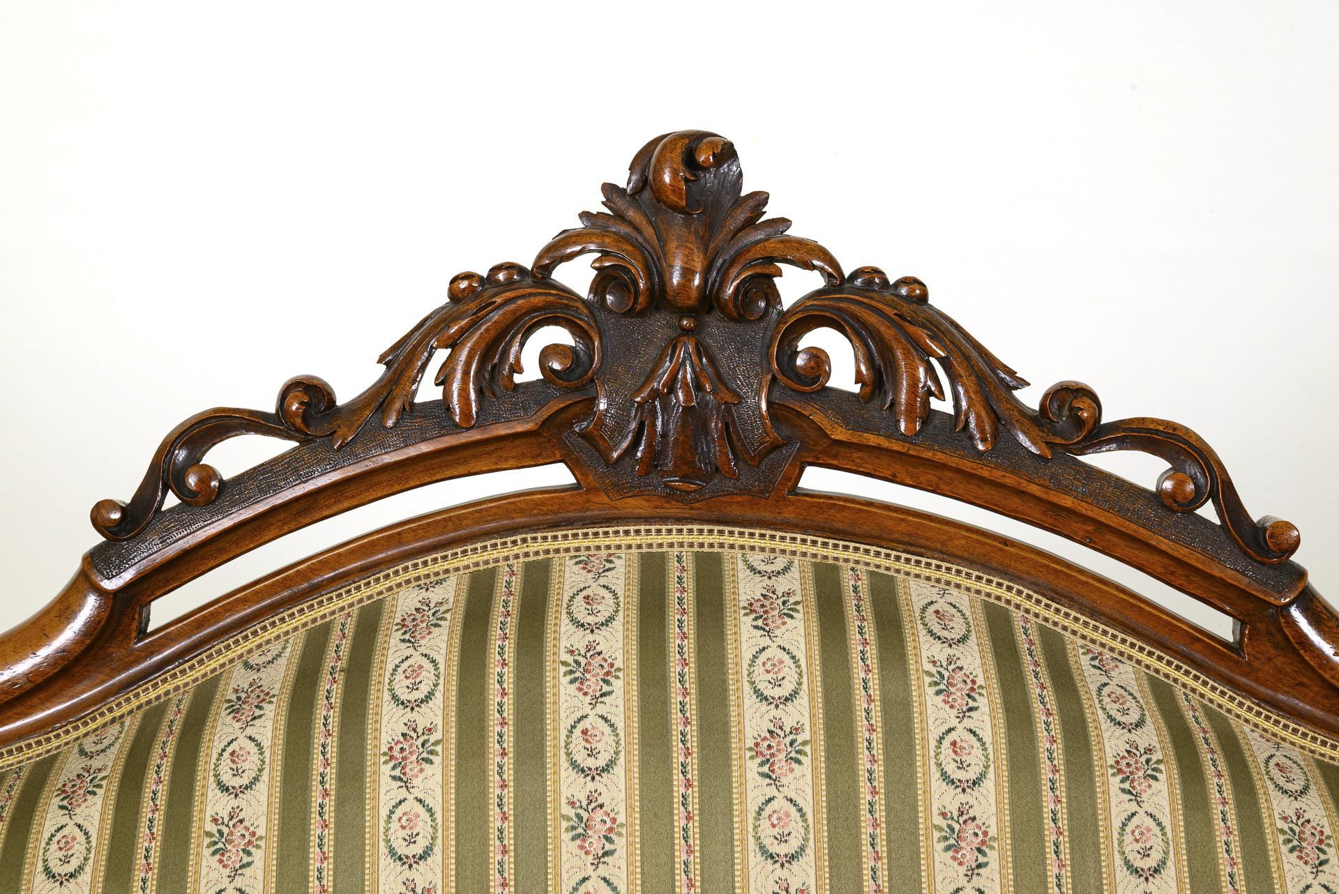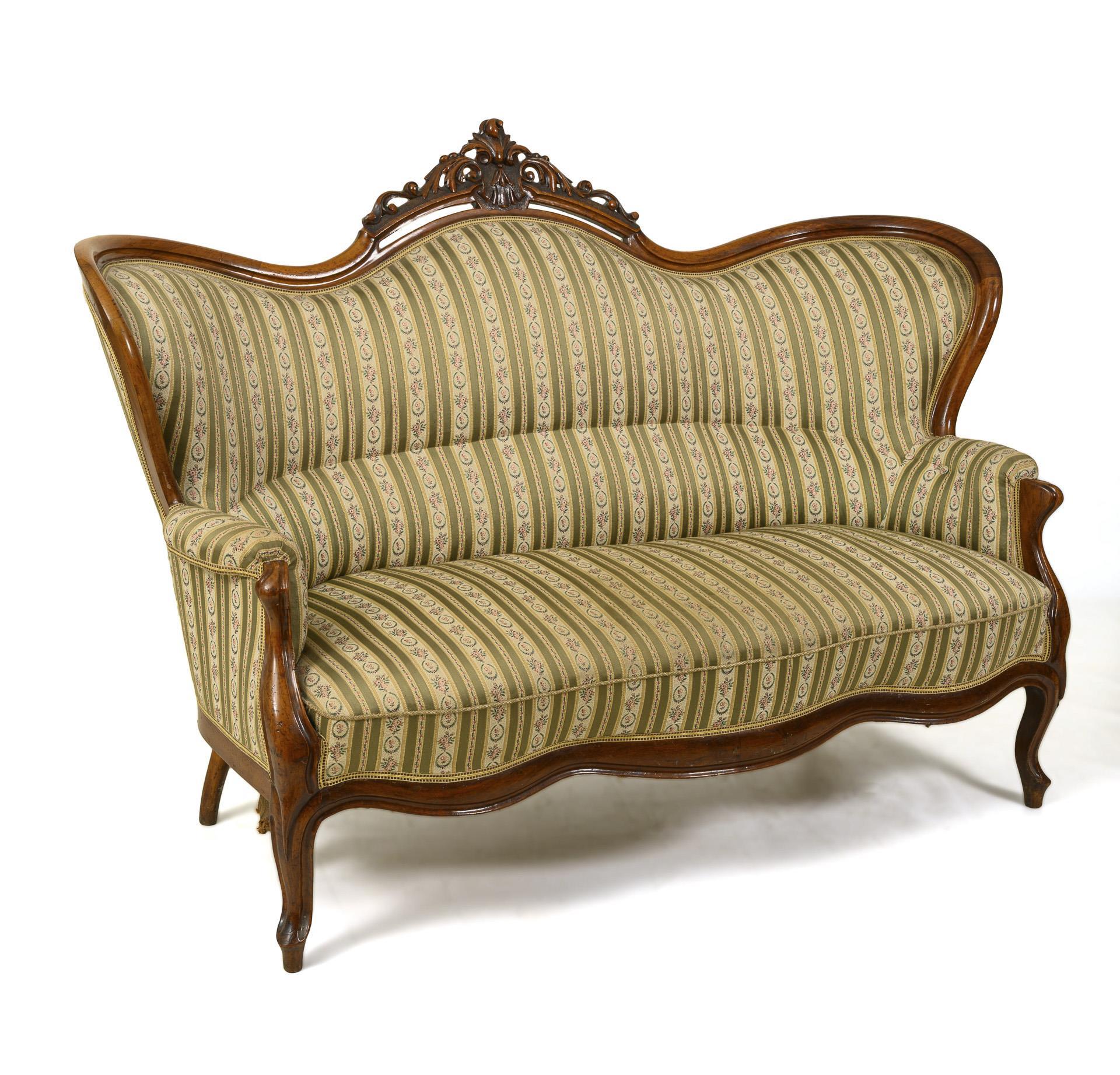 Elegantes Sofa mit dreifach geschweifter Rückenlehne und floral beschnitzter Krone, gepolsterten Armlehnen und 4 geschwungenen Beinen. Jünger gepolstert und mit hellem Streifenstoff bezogen. Restauriert, mit Ergänzungen. Minimale Fehlstellen, leichte Gebrauchsspuren.
