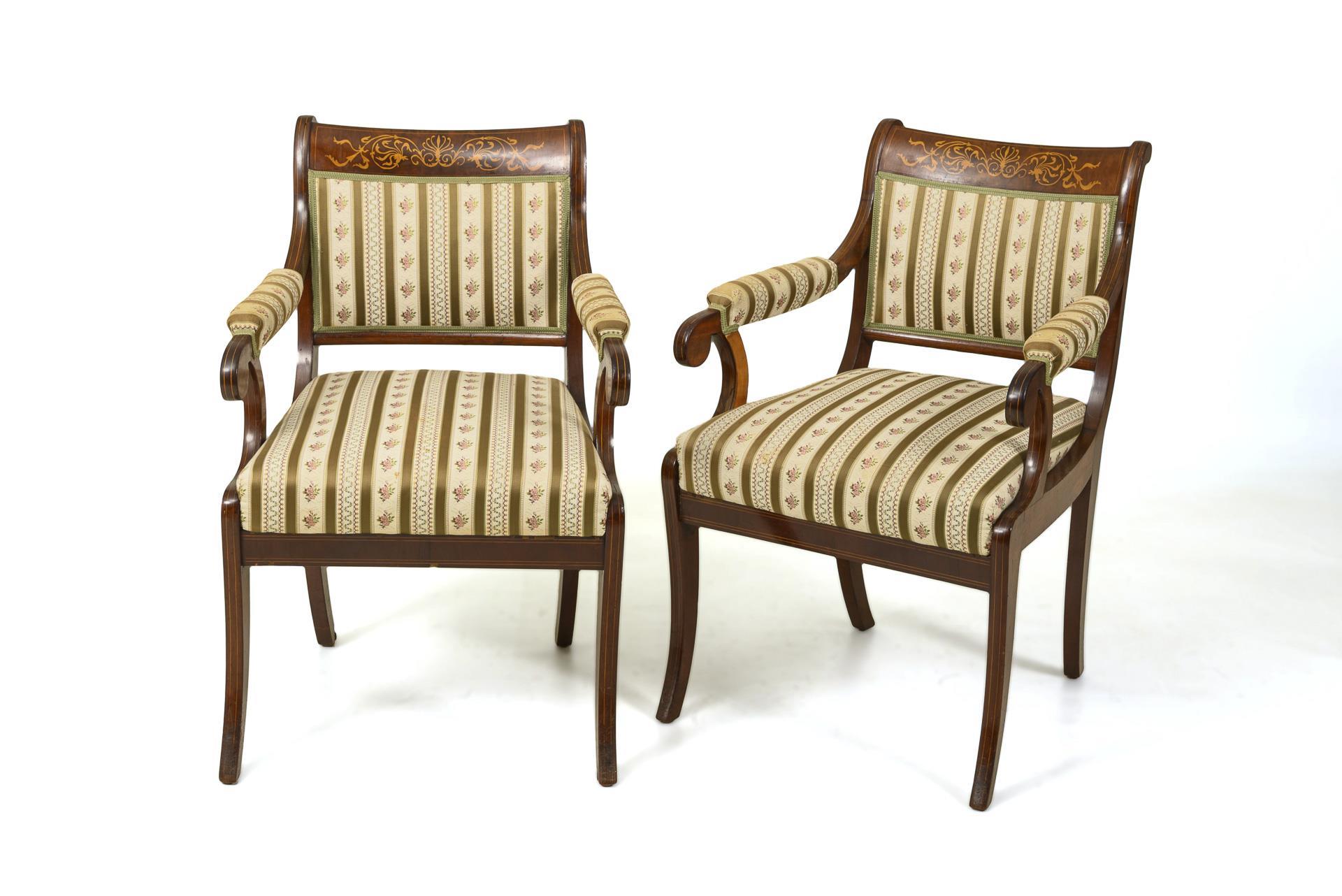 Seitenrahmenkonstruktion. Gepolsterte Rückenlehne mit geradem Lehnbrett und floraler Intarsierung, endvolutierte und teilgepolsterte Armstützen, trapezförmige Sitzfläche mit jünger gepolsterter Sitzauflage und klassizistischem Streifenstoffbezug, auf 4 gebogten Spitzbeinen. Restauriert, mit Ergänzungen. Leichte Gebrauchsspuren, inaktiver Anobienbefall.