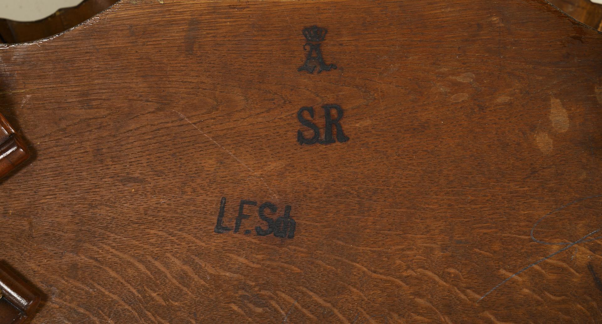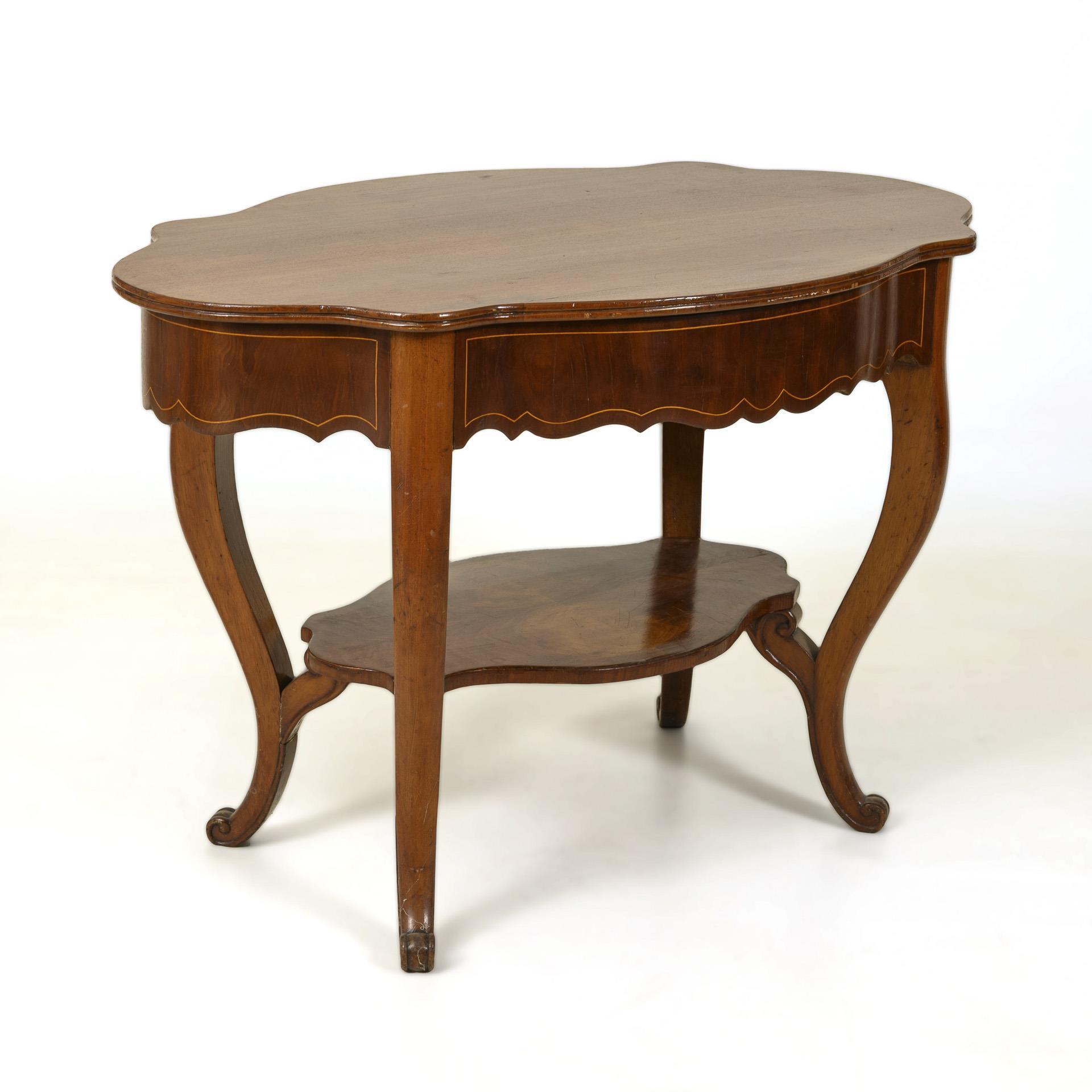 Ovale Deckplatte in geschweifter Form und mit profilierter Kante, mehrfach geschweifte Zarge, Zwischenablage, auf 4 geschwungenen Beinen mit Volutenzier. Restauriert. Alters- und Gebrauchsspuren, partiell Fehlstellen, Kratzspuren, Risse.