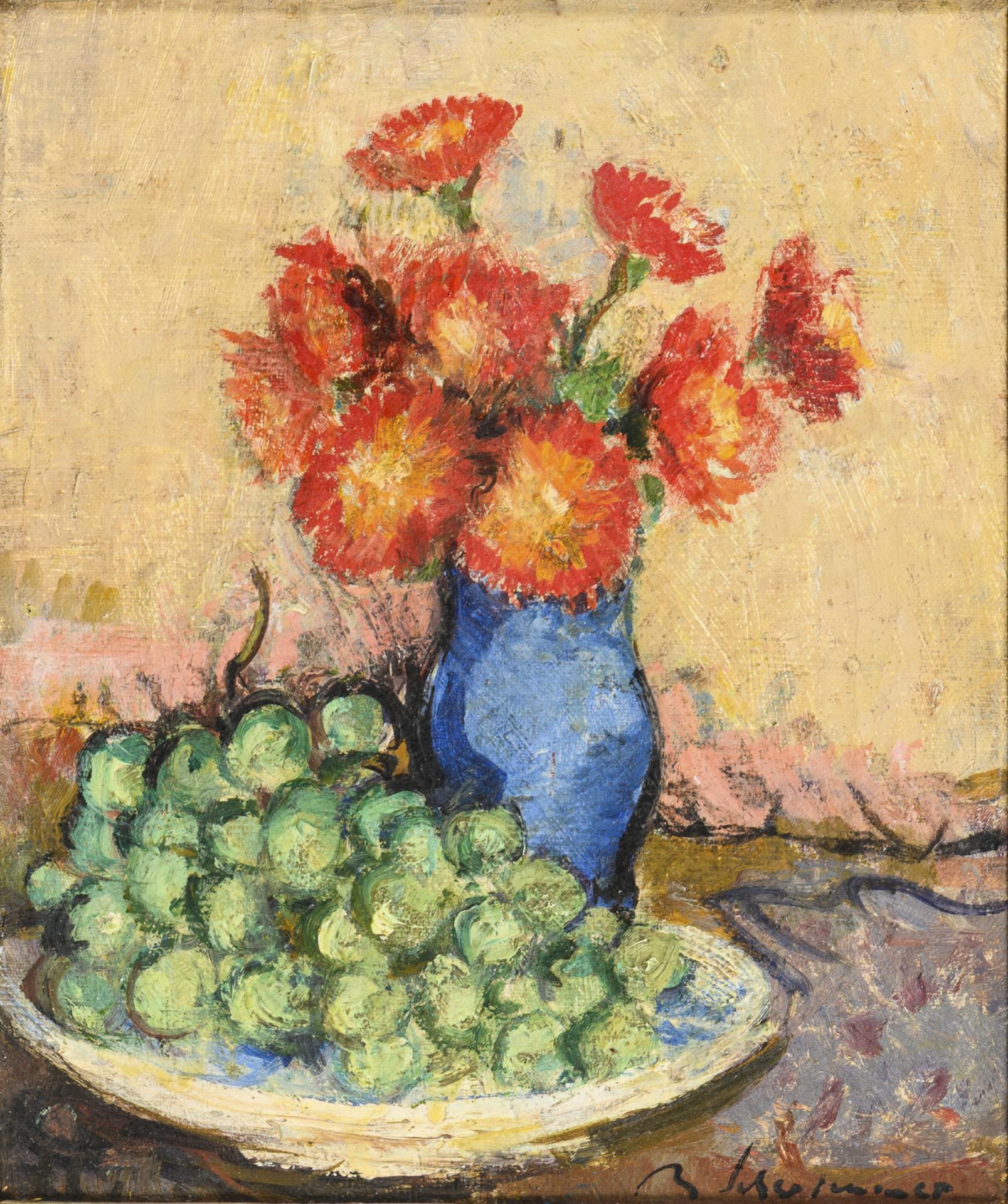 Trauben auf einem Teller neben einem Blumenstrauss in blauer Vase.