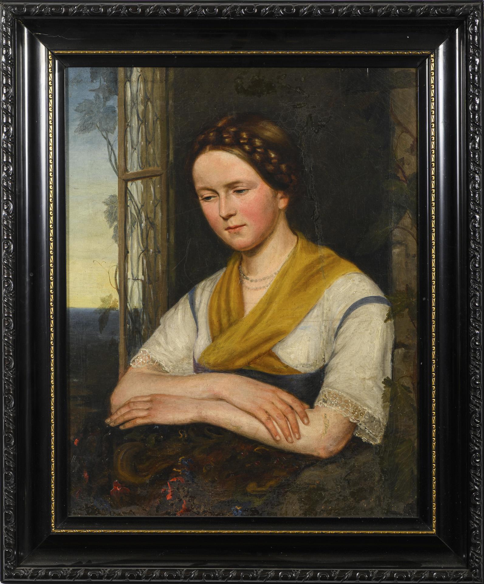 Porträt einer jungen Frau an einem geöffneten und mit Wein umranktem Fenster im Sonnenschein mit nachdenklichem Blick und übereinander gelegten Armen. Leinwand wachsdoubliert.