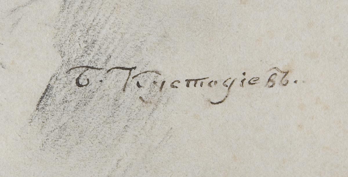 Bleistiftzeichnung, partiell koloriert. Kyrillisch signiert.