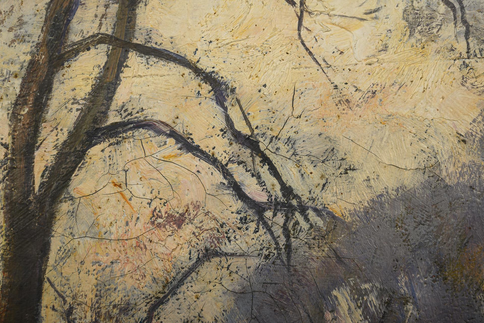 Ruhiger Flusslauf mit teils kahlen Bäumen an einer Wiese unter bedecktem Himmel. Farbabsplitterungen.