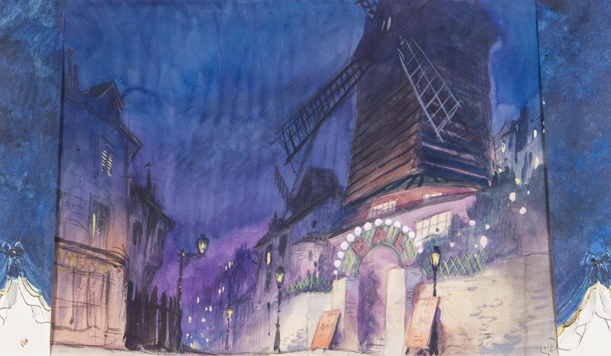 Varieté Theater, Cabaret im Pariser Stadtviertel Montmatre. Seitlich lose bemalte Vorhang-Streifen mit Monogramm-Stempel. Verglaster Stuckrahmen mit applizierten Holz-Ecken und Messing-Köpfen. Rahmen partiell leicht defekt.