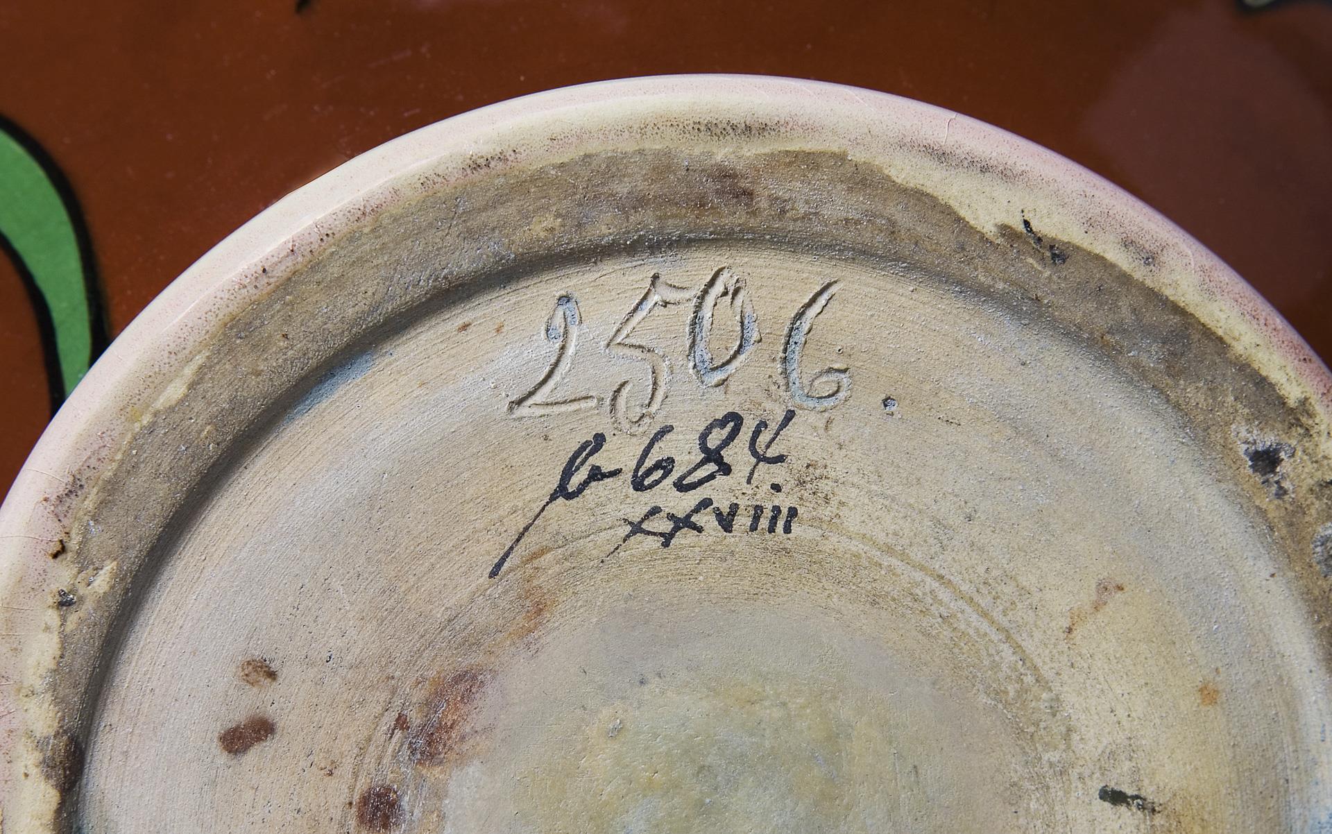 Norica-Fayence, umlaufend stilisierte florale farbige Unterglasurmalerei. Ritzmarke, Malermarke, ohne Stempelmarke.
