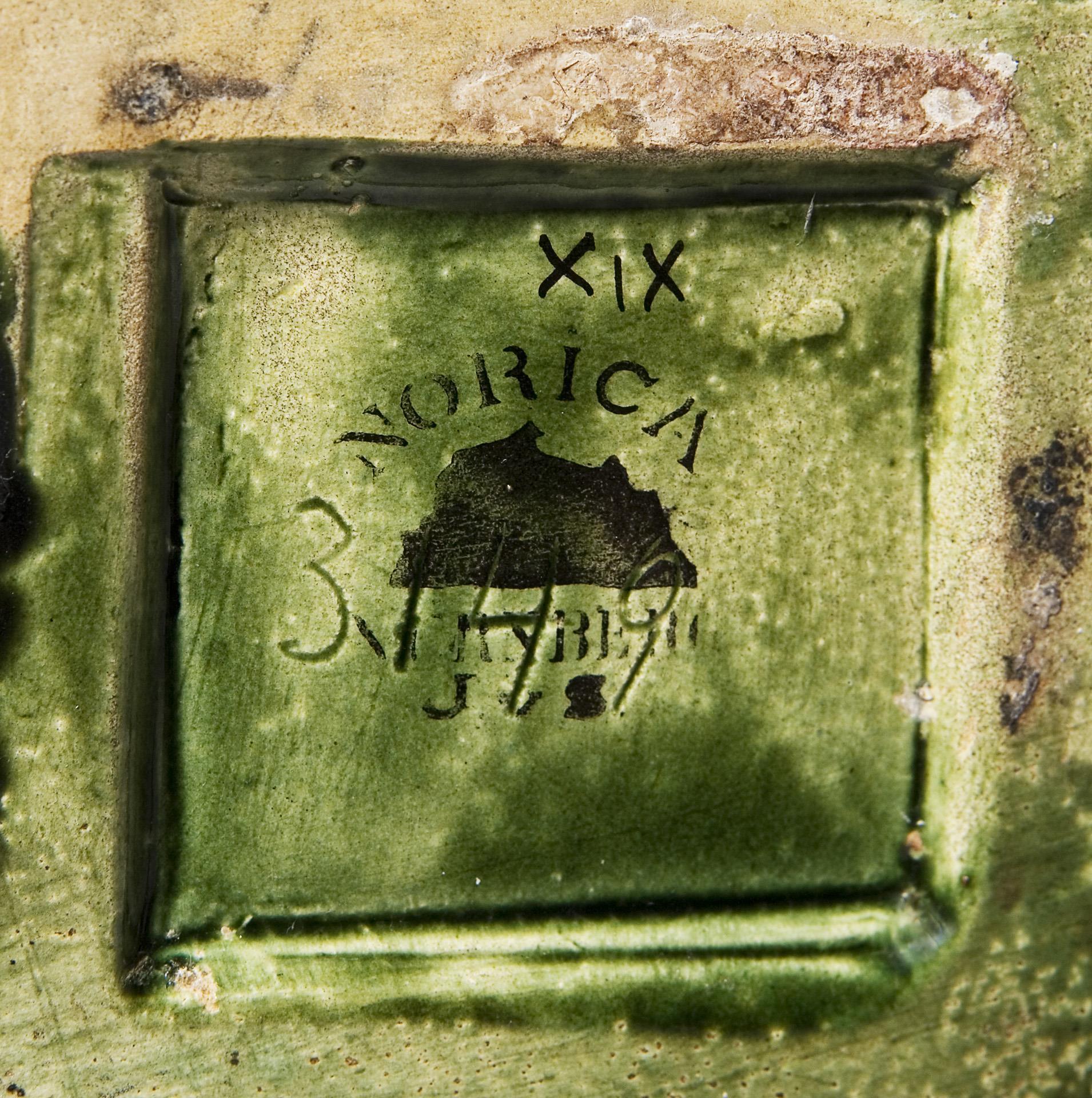 Norica-Fayence, umlaufend florale farbige Unterglasurmalerei über lachsfarbenem Fond. Ritzmarke, Malermarke, schwarze Stempelmarke. Mündung leicht bestoßen.