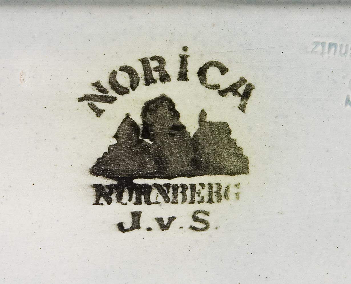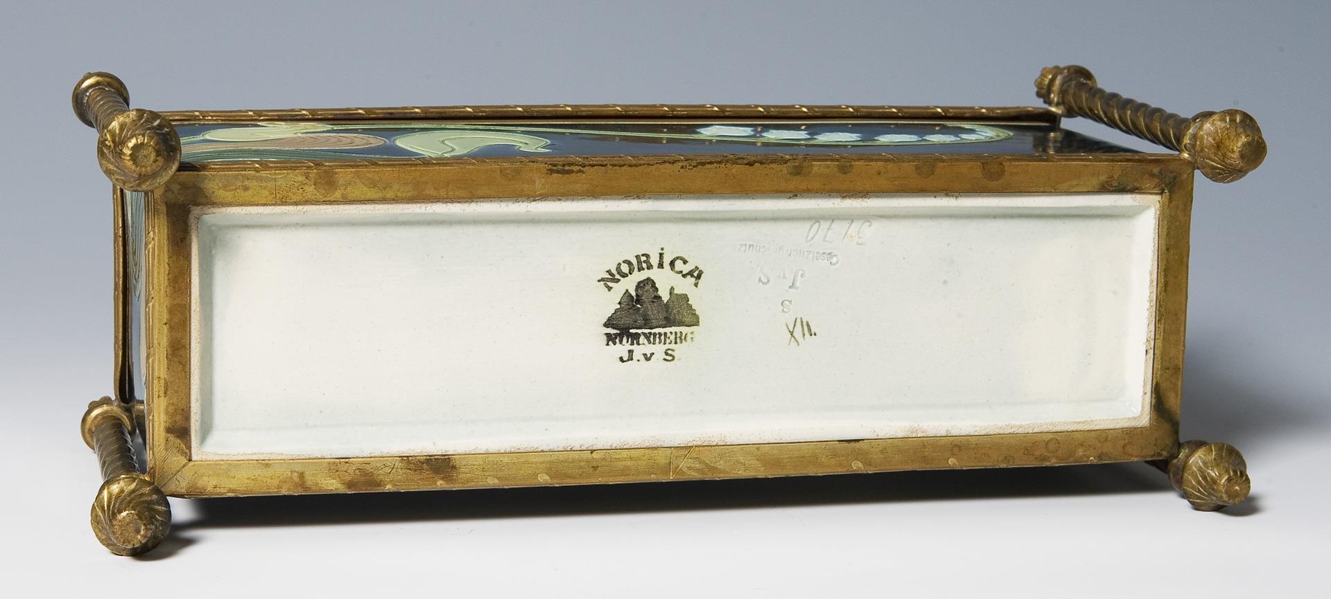 Norica-Fayence, umlaufend stilisierte florale farbige Unterglasurmalerei. Metallmontierung mit vier gedrehten Vollsäulen. Pressmarke, Malermarke, Ritzmarke, schwarze Stempelmarke.
