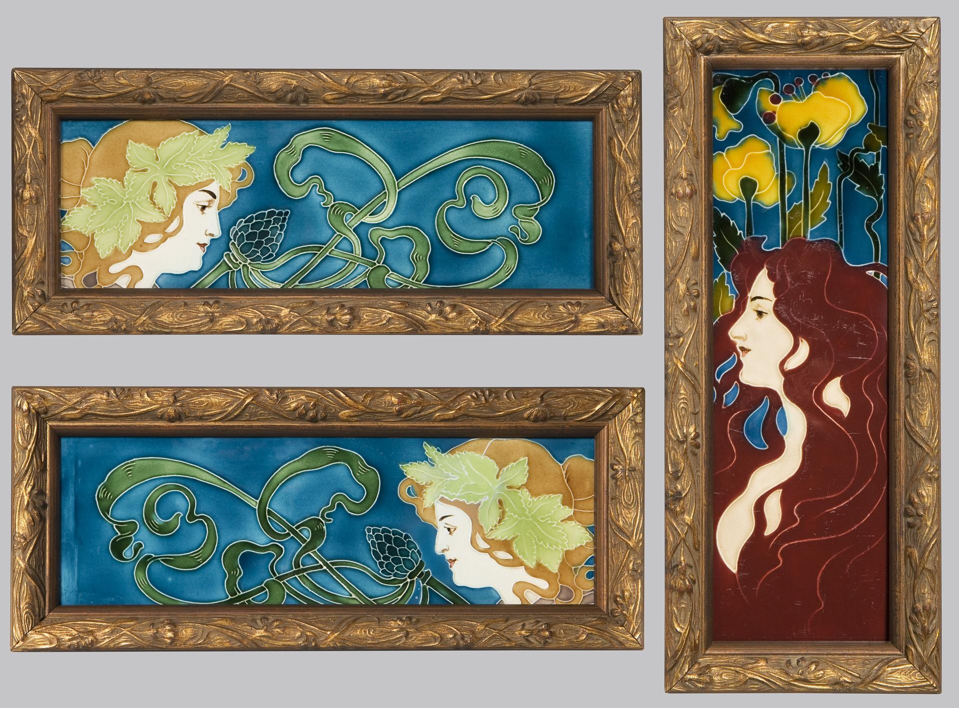 3 Jugendstil-Fliesen im Stuckrahmen. Johann von Schwarz, Nürnberg.