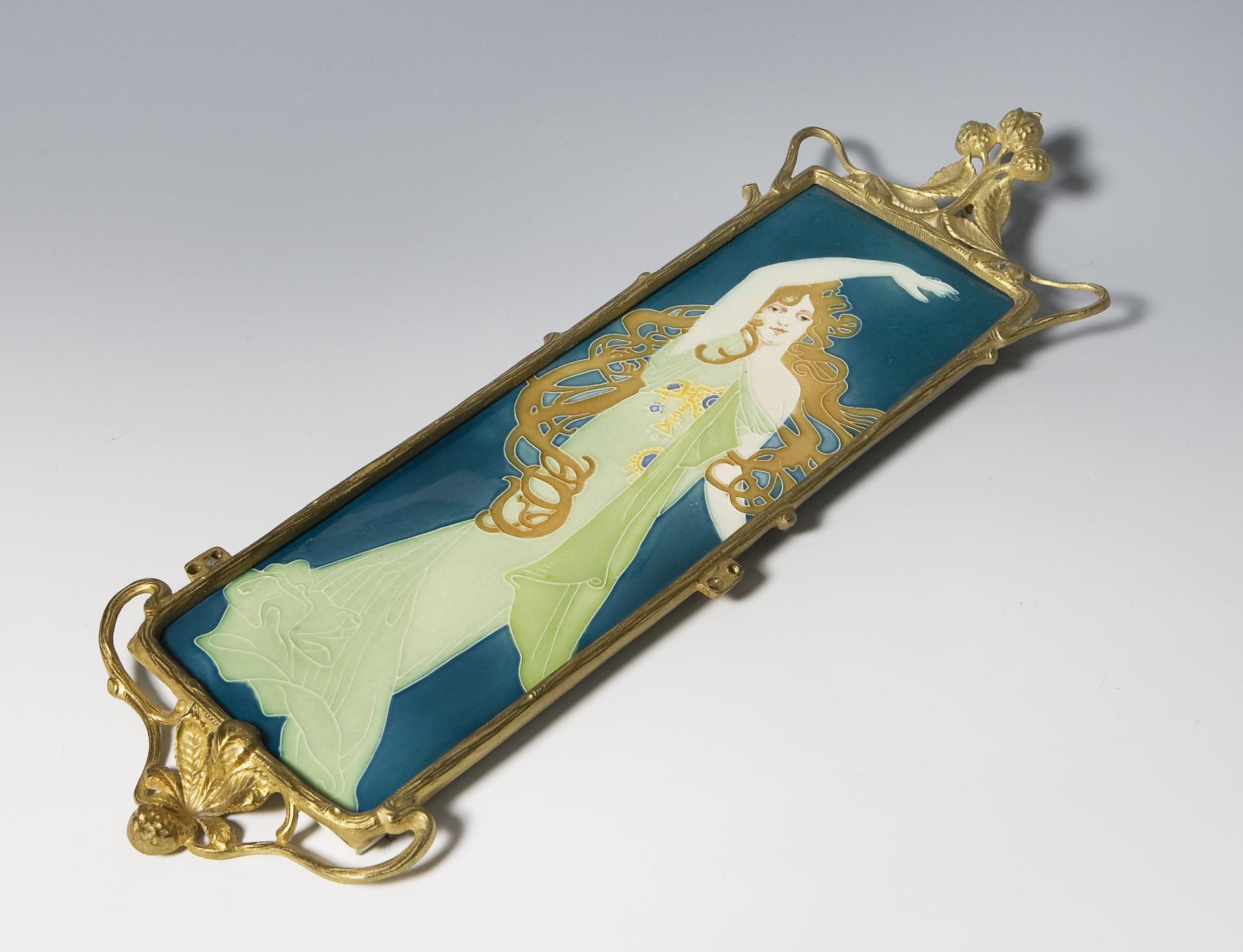 Jugendstil-Fliese im vergoldeten Metallrahmen. Johann von Schwarz, Nürnberg.