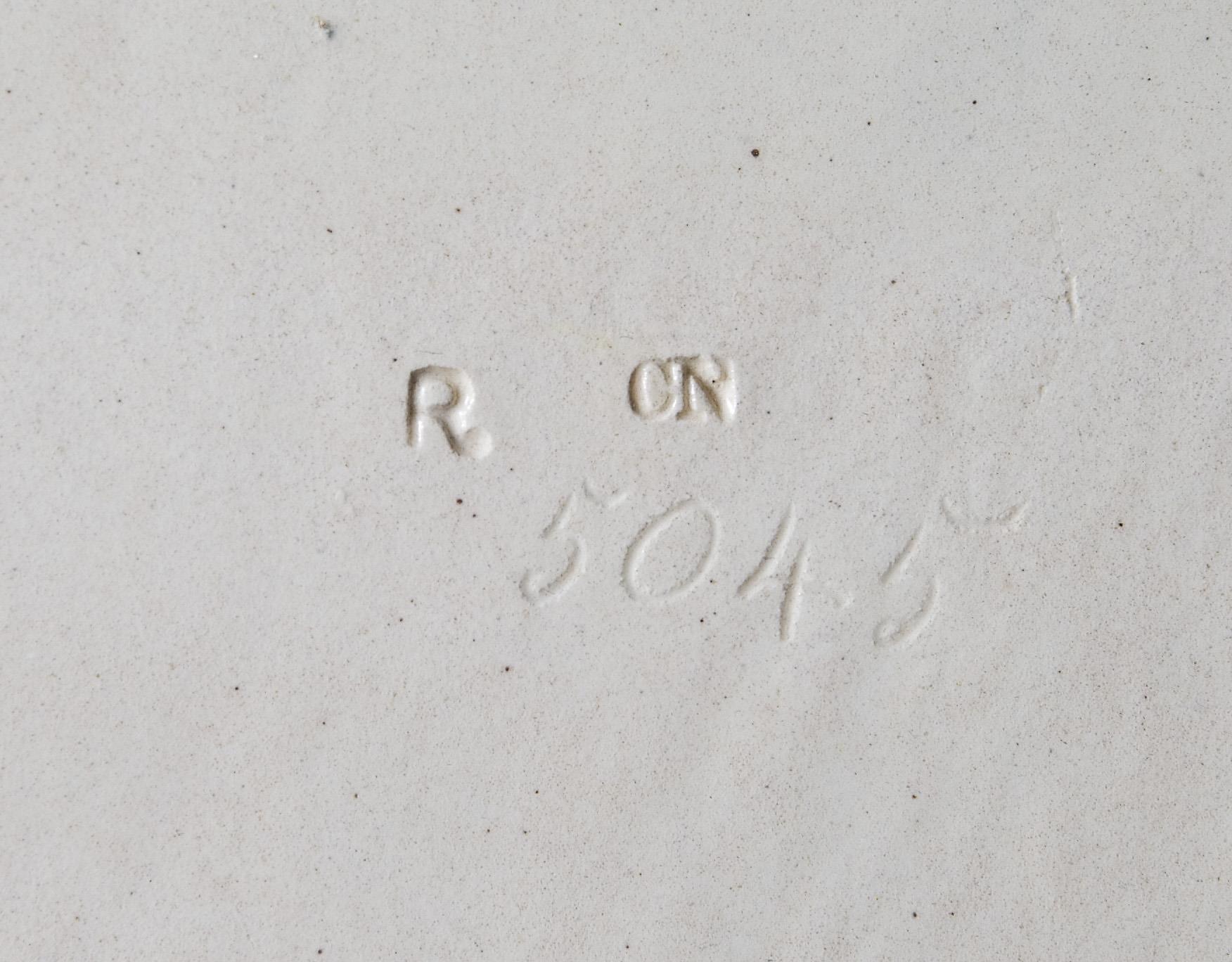Norica-Fayence, farbige Unterglasurmalerei in Fadenrelief-Technik. Pressmarken, Ritzmarke, Malermarke. Metall-Montierung mit seitlichen Handhaben.