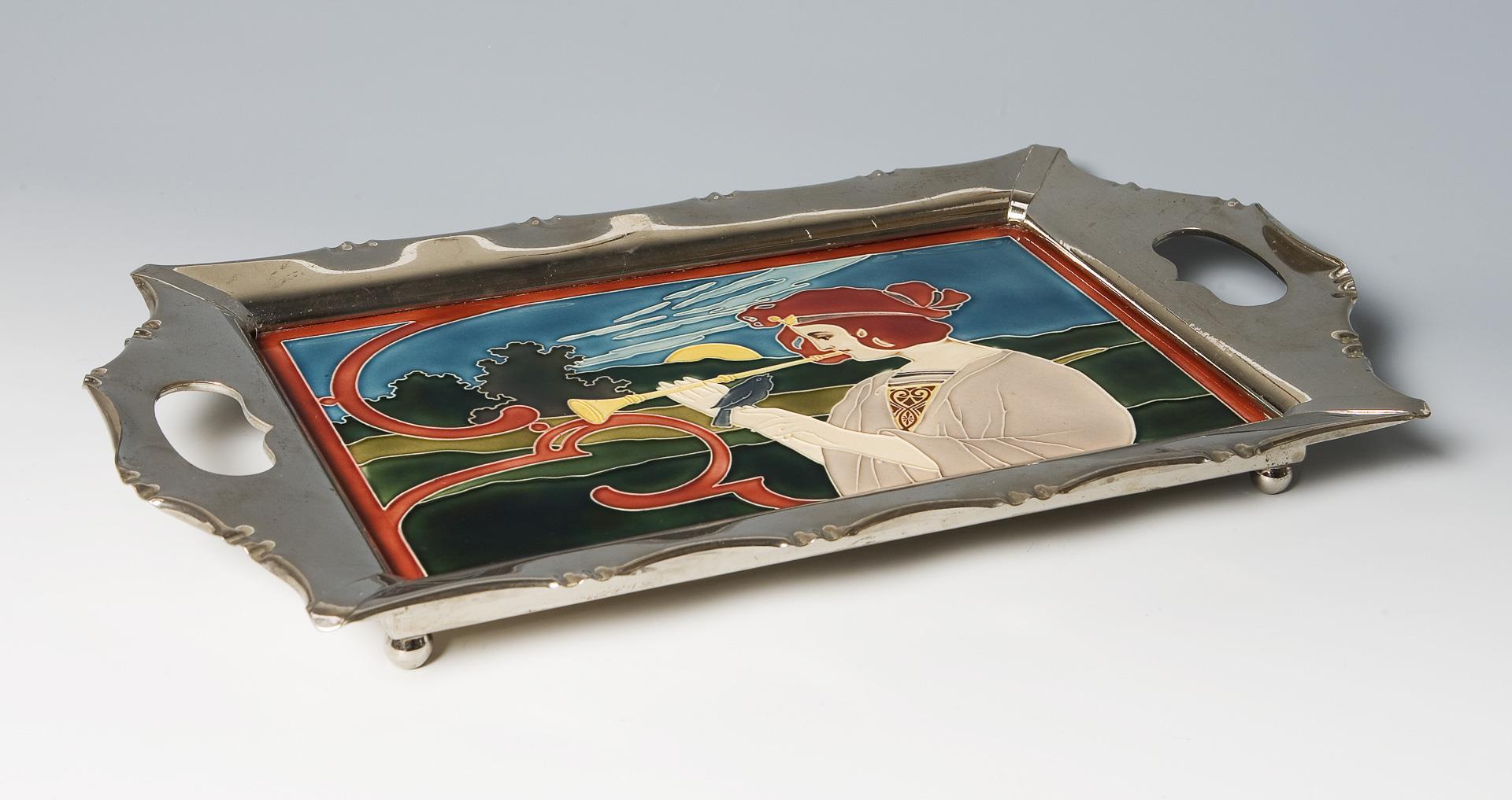 Jugendstil-Tablett mit Fliese. Johann von Schwarz, Nürnberg.