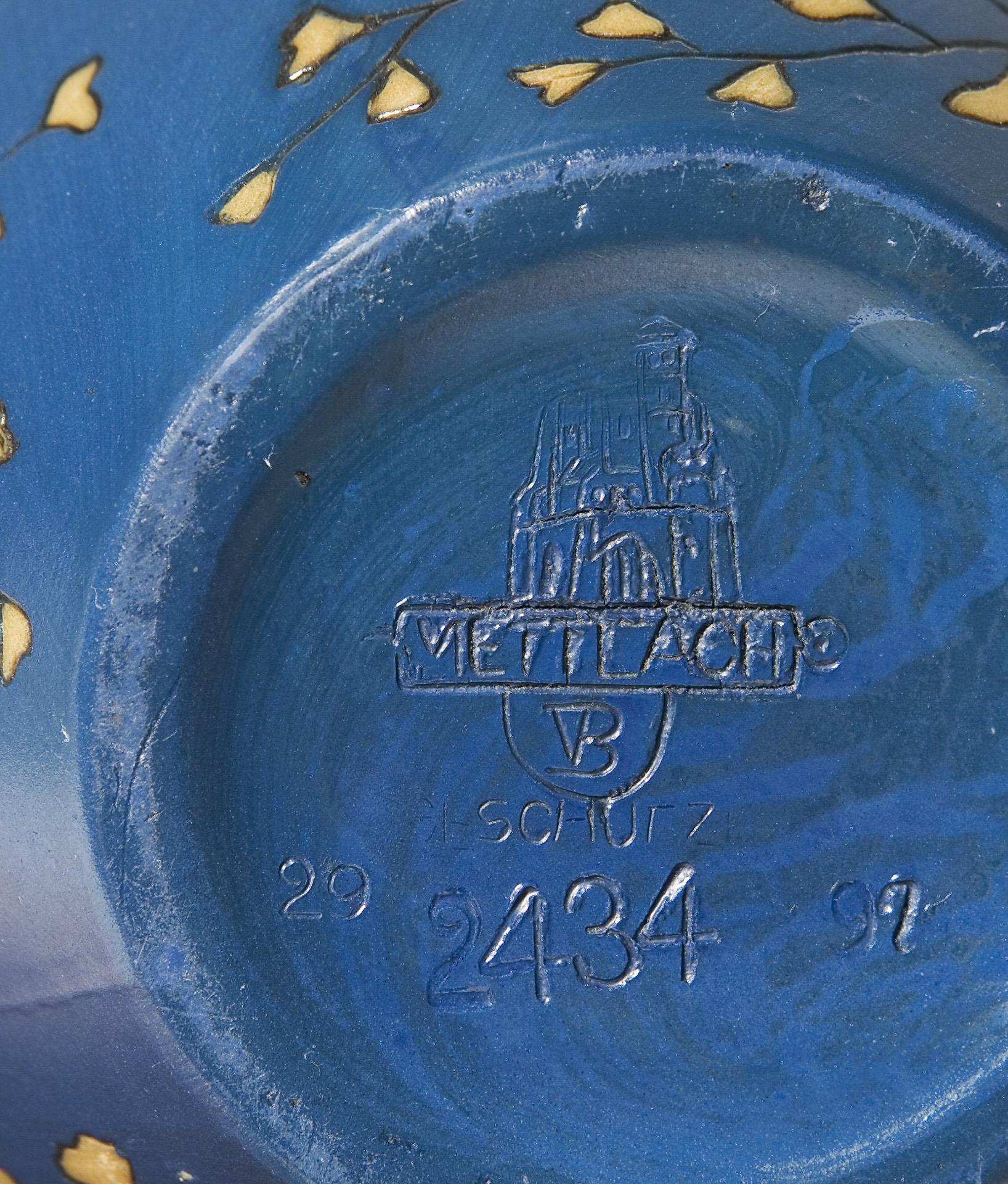 Feinsteinzeug, blauer Fond, umlaufend farbig bemaltes florales Ritzdekor. Balusterkorpus mit wellenförmig gebogter Mündung. Pressmarken.