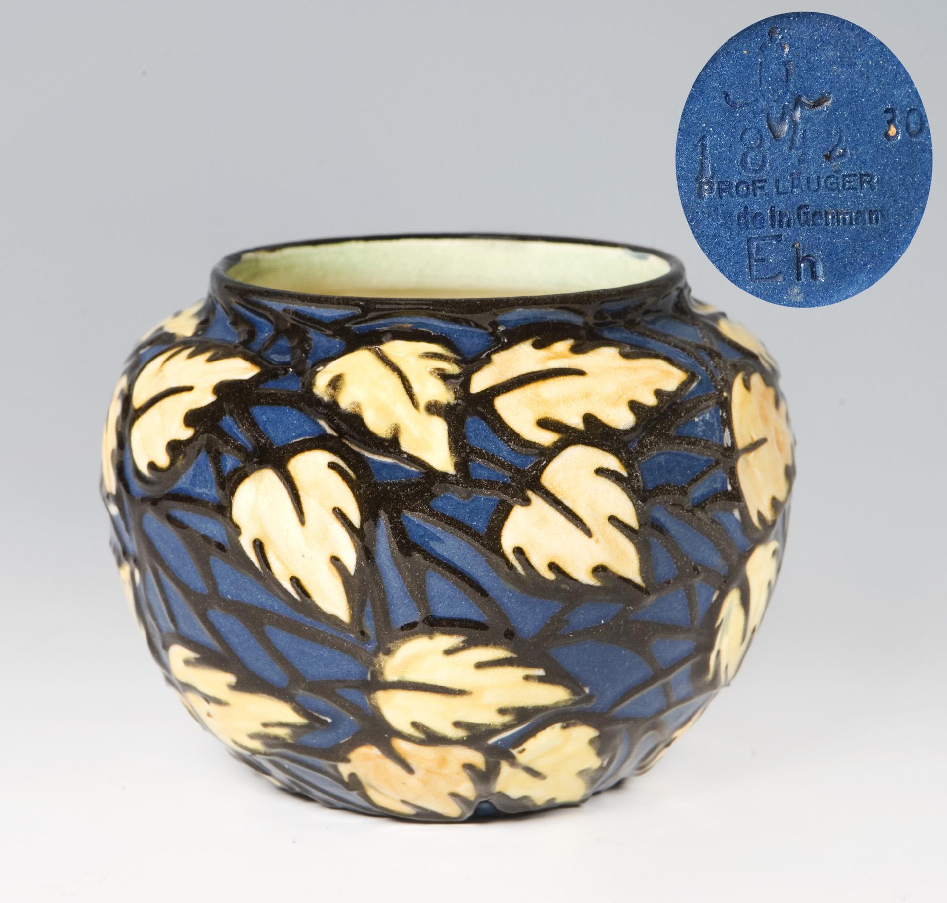 Kleine Laeuger-Vase mit Blätterdekor. Karlsruher Majolika.