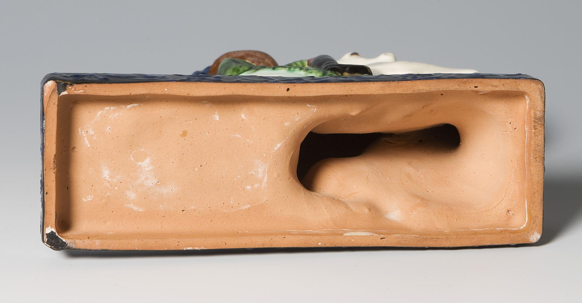 Ausführung vermutlich Tonwerke Kandern. Rötlicher Scherben, farbig bemalt und glasiert. Künstler-Signet, ohne Manufakturmarke. Partiell diverse, teils sichtbar nachgebesserte, Glasurabplatzer, Hutkrempe sichtbar restauriert.