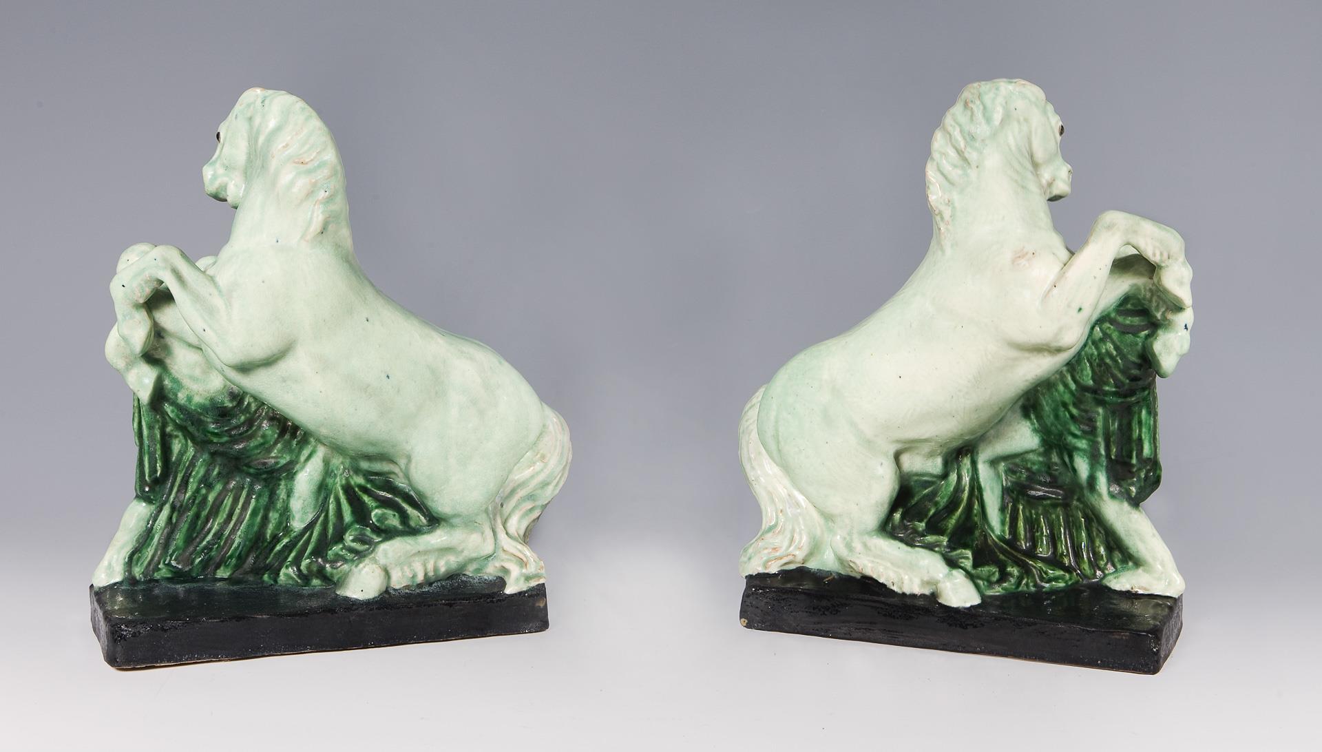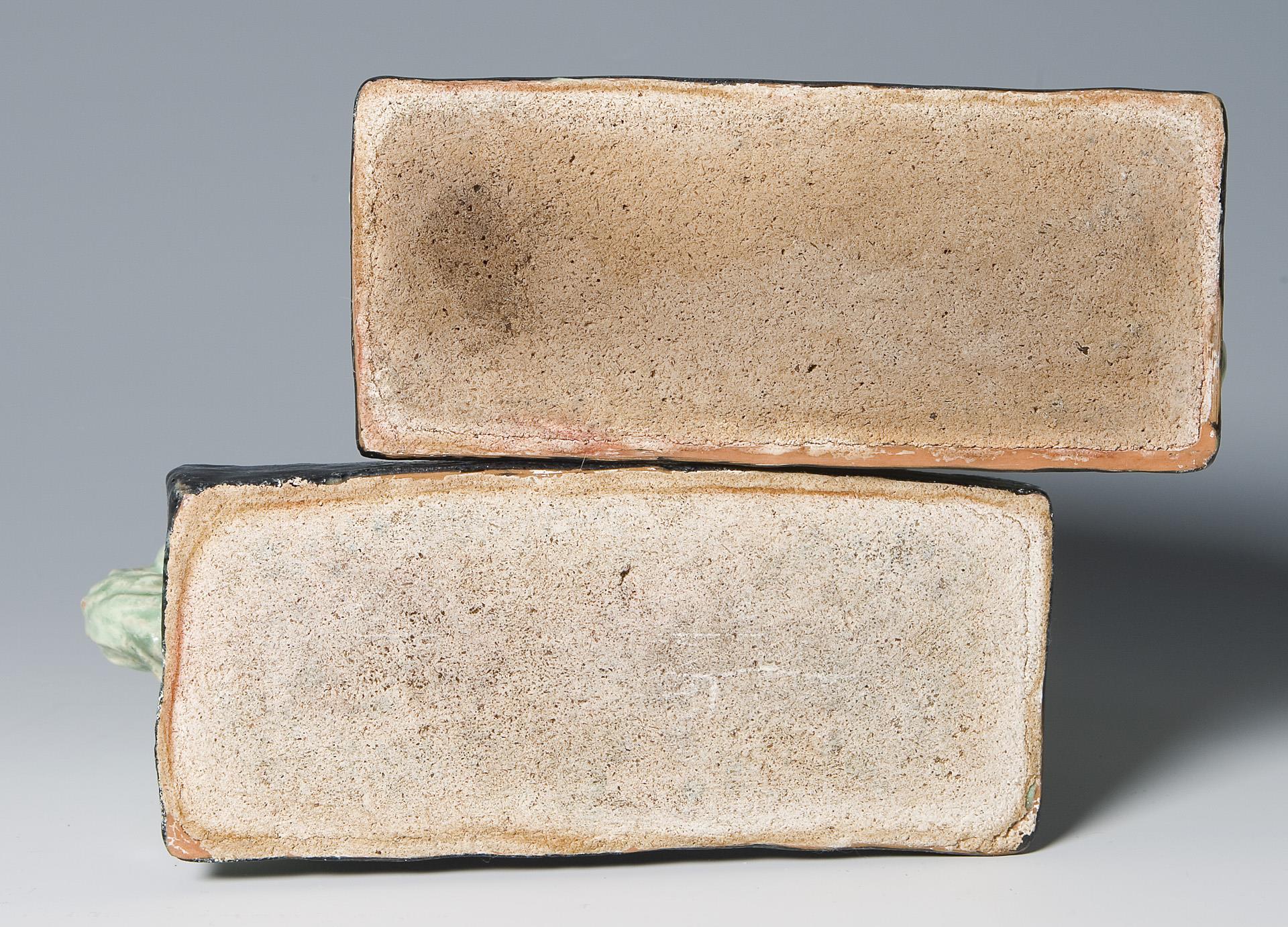 Rötlicher Scherben, hellgrün und dunkelgrün bemalt, glasiert. Sockelböden gefüllt, ohne sichtbare Manufakturmarken. Ein kleiner Brandriss, minimale Glasurabplatzer, ein Sockel partiell restauriert, eine Figur mit unreiner Glasur.