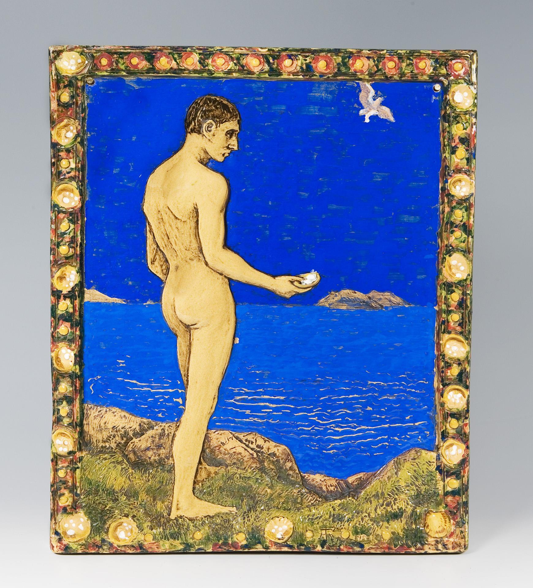 Farbig bemalt, glasiert. Frontal Künstler-Signet, datiert: 1902, rückseitig schwarze Manufakturmarke. Mittig im Blau kleiner Glasurabplatzer.
