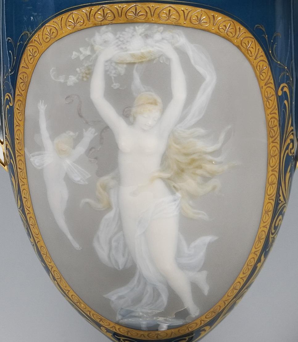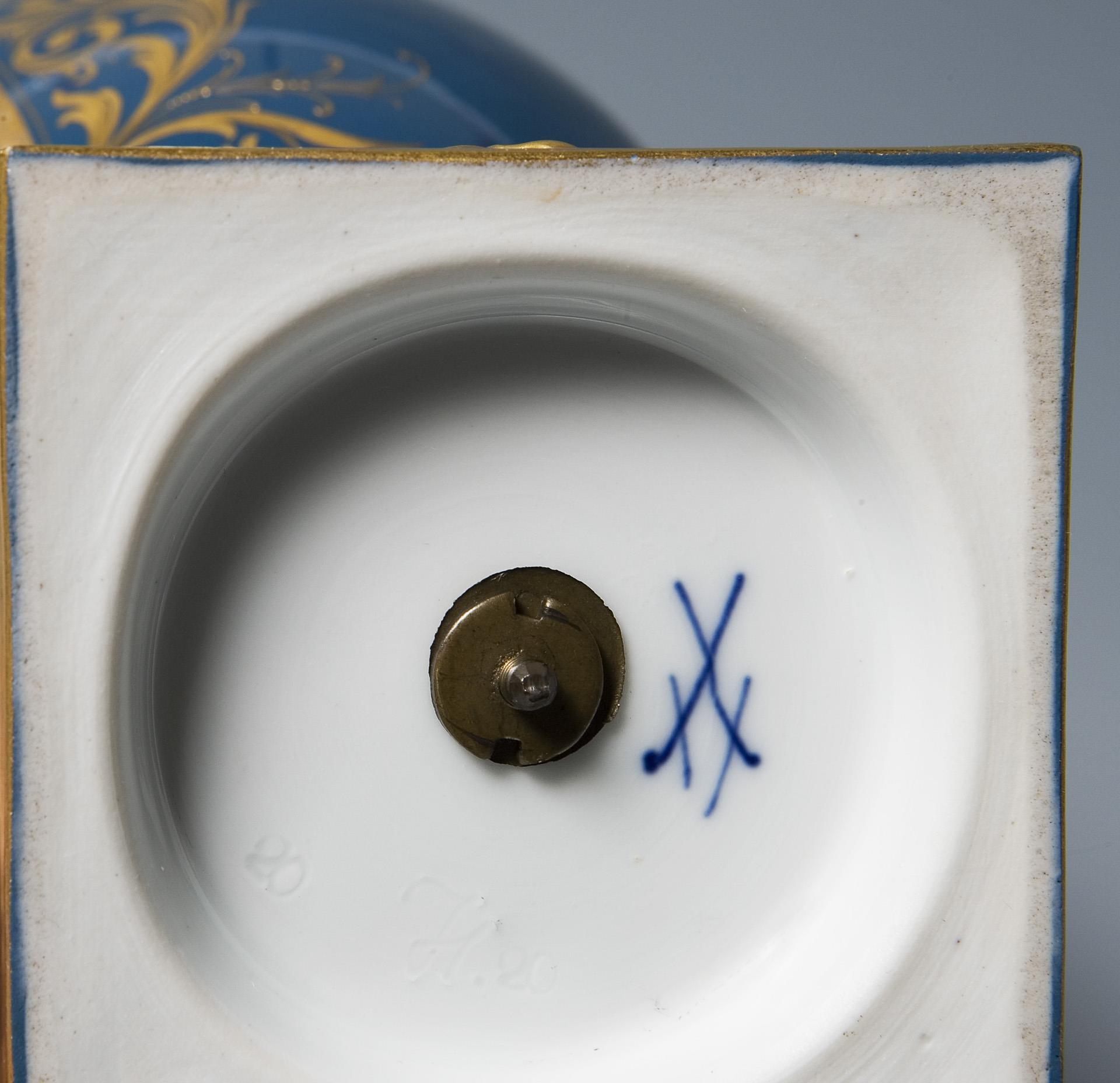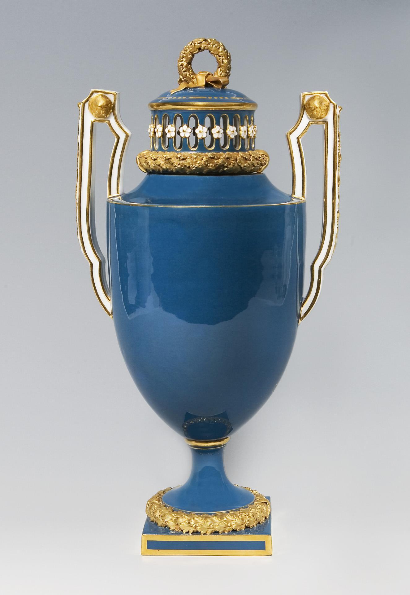 Form-Modell von Christian Gottfried Jüchtzer und Mitarbeiter. Modell-Jahr: 1782-1785 (Form), Pâte-sur-pâte-Dekor um 1900. Floral reliefiert, mittelblauer Fond, reiche Goldstaffage. Frontal "Schwebende Flora mit Amorette" in großflächiger Ovalreserve. Montierter Rundfuß über quadratischer Plinte. Ritzmarke, Pressmarke, Schwertermarke. Deckelplatte fachmännisch restauriert.
