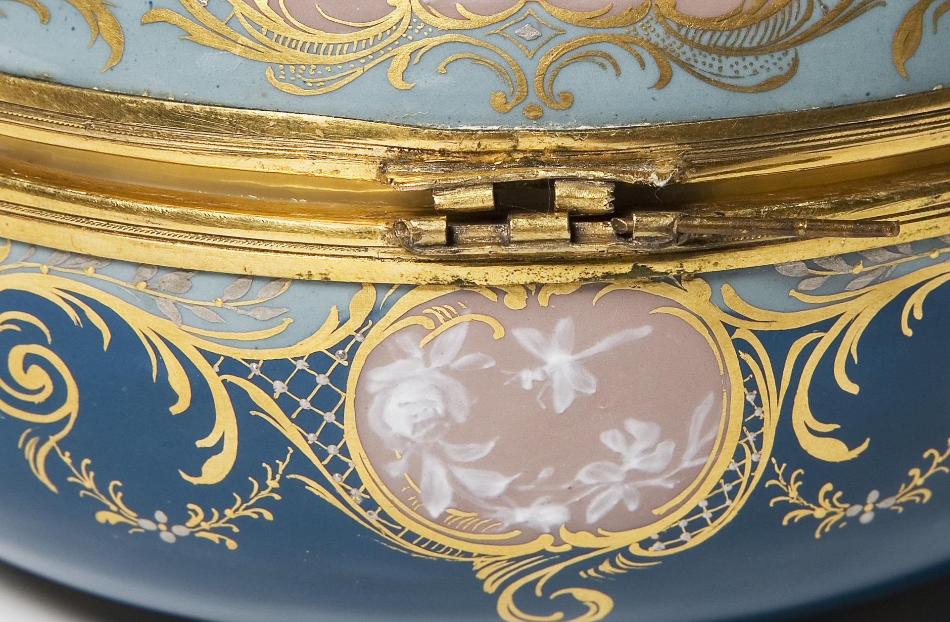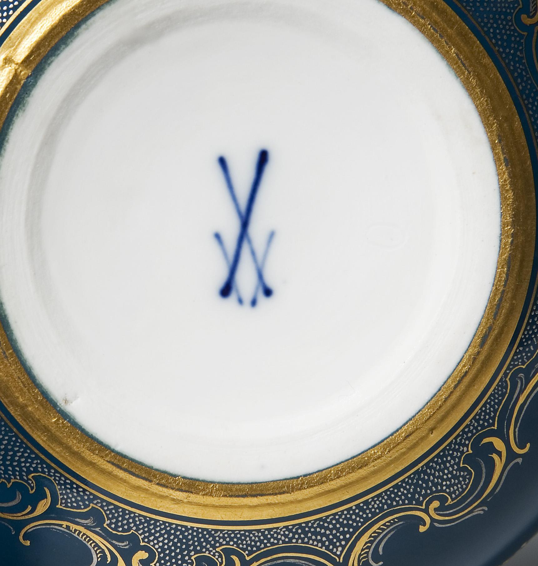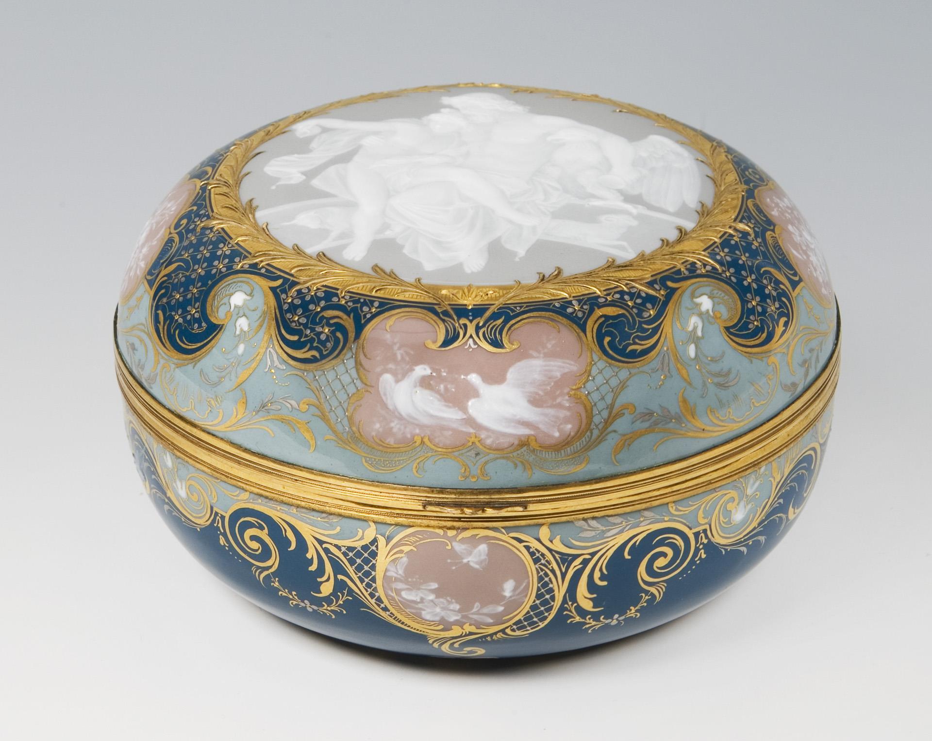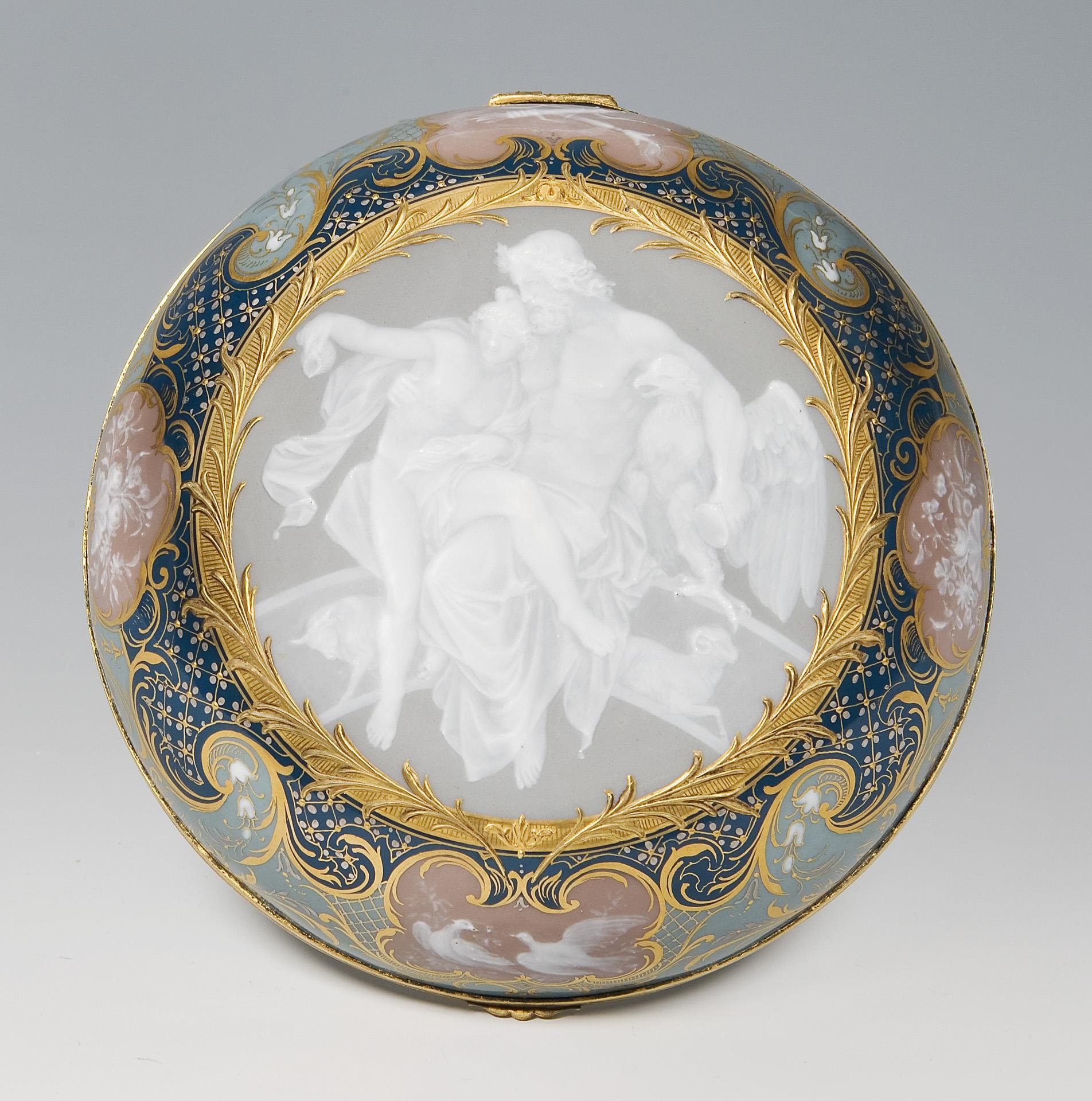 Umlaufend reiches Golddekor, Reliefgold und Pâte-sur-pâte-Malerei über verschieden farbigem Fond. Auf dem Deckel "Hebe und Jupiter" in großflächiger Reserve, umlaufend in kleinen Reserven Taubenpaar, Blüten und Amor-Trophäen. Profilierte Messing-Montierung mit geschweiftem Daumengriff. Schwertermarke. Scharnier der Messing-Montierung defekt.