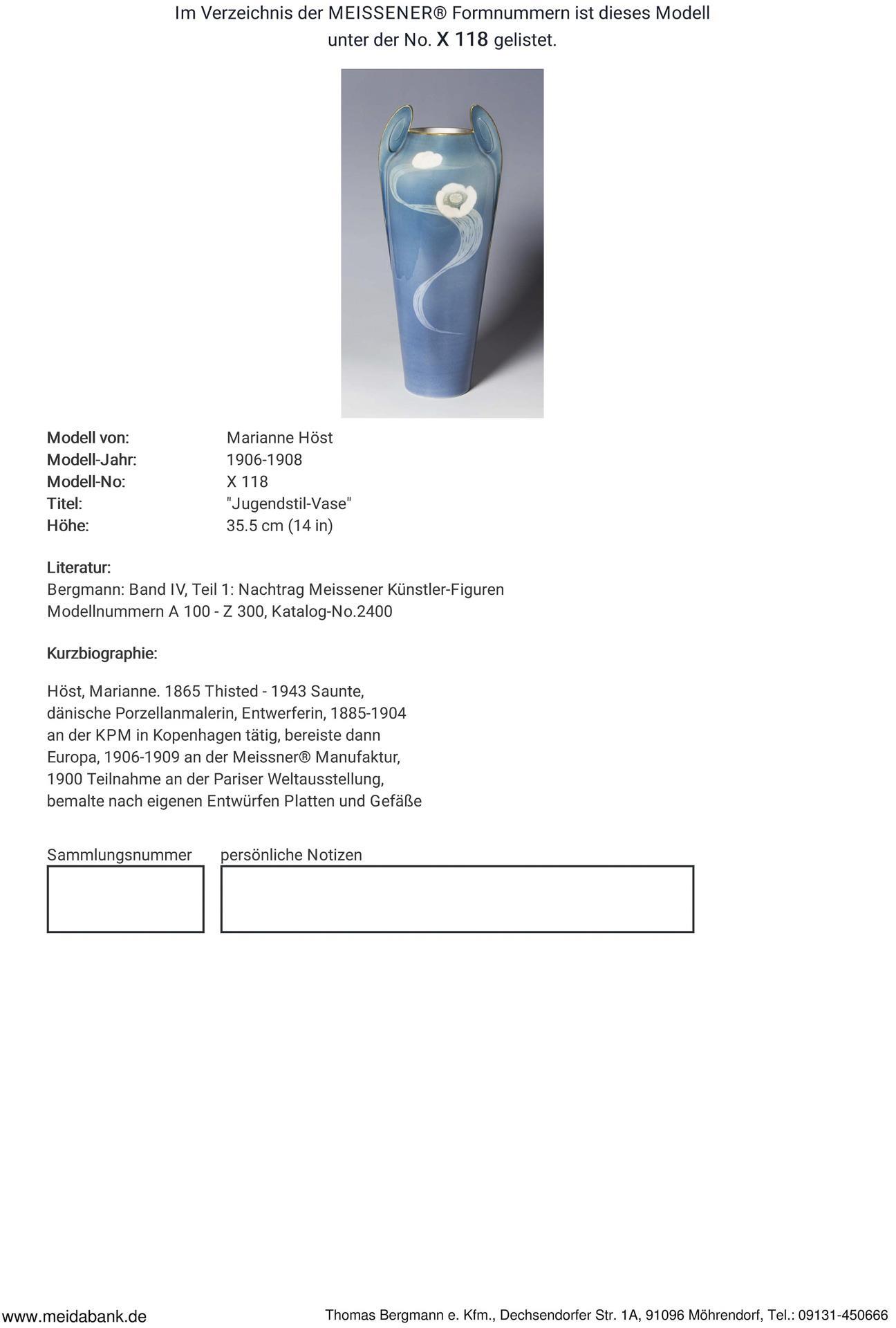 * Höst, dänische Porzellanmalerin, Designerin, 1885-1904 an der KPM in Kopenhagen tätig, bereiste dann Europa. 1906-1909 an der Porzellanmanufaktur Meissen tätig, sie bemalte nach eigenen Entwürfen diverse Gefäße.