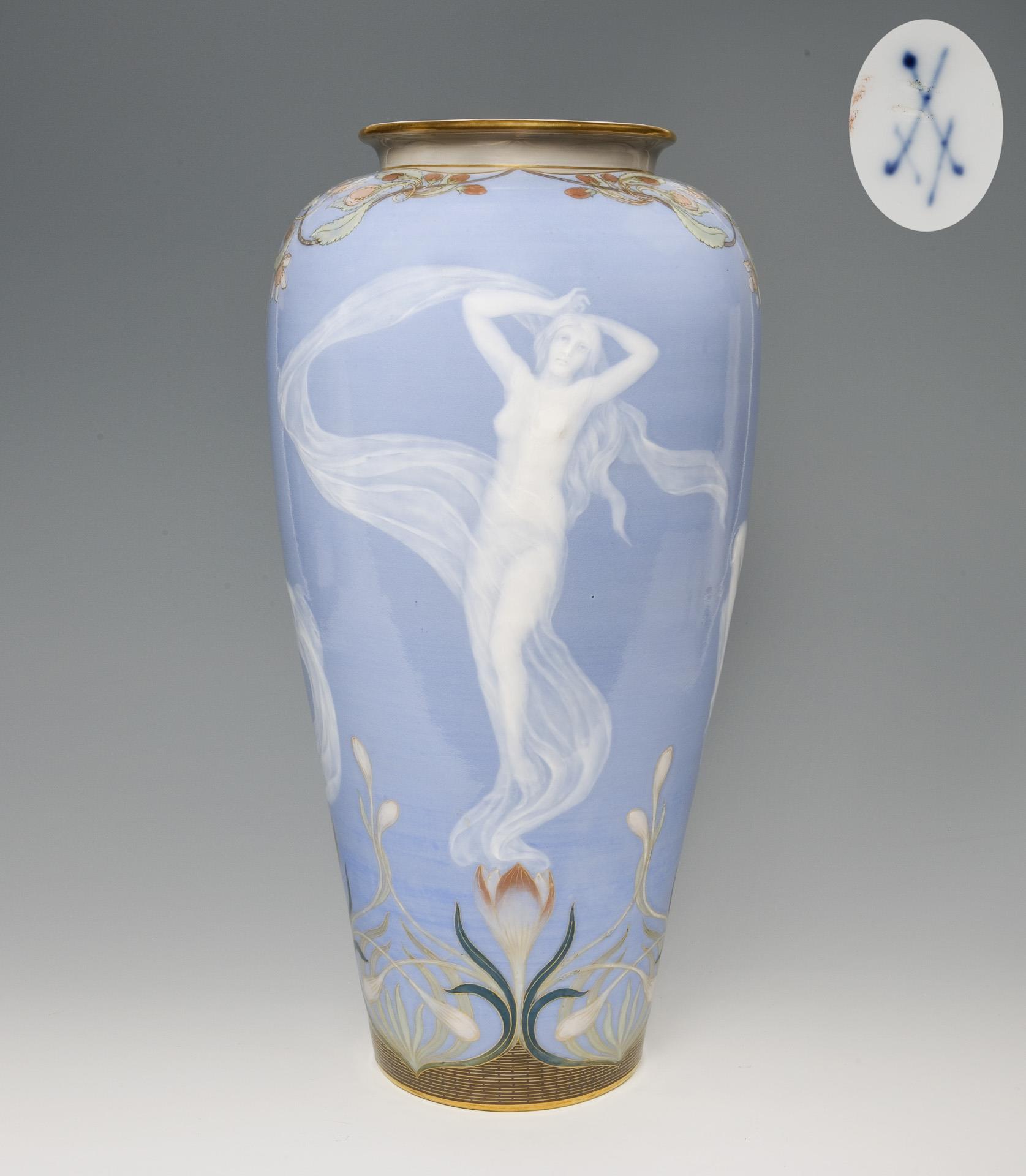 Umlaufend zwischen floraler farbiger, gold konturierter Jugendstil-Massemalerei vier schwebende Nymphen in Pâte-sur-pâte-Technik auf hellblauem Fond, Goldstaffage. Ritzmarke, Pressmarke, Schwertermarke zweimal gestrichen.
