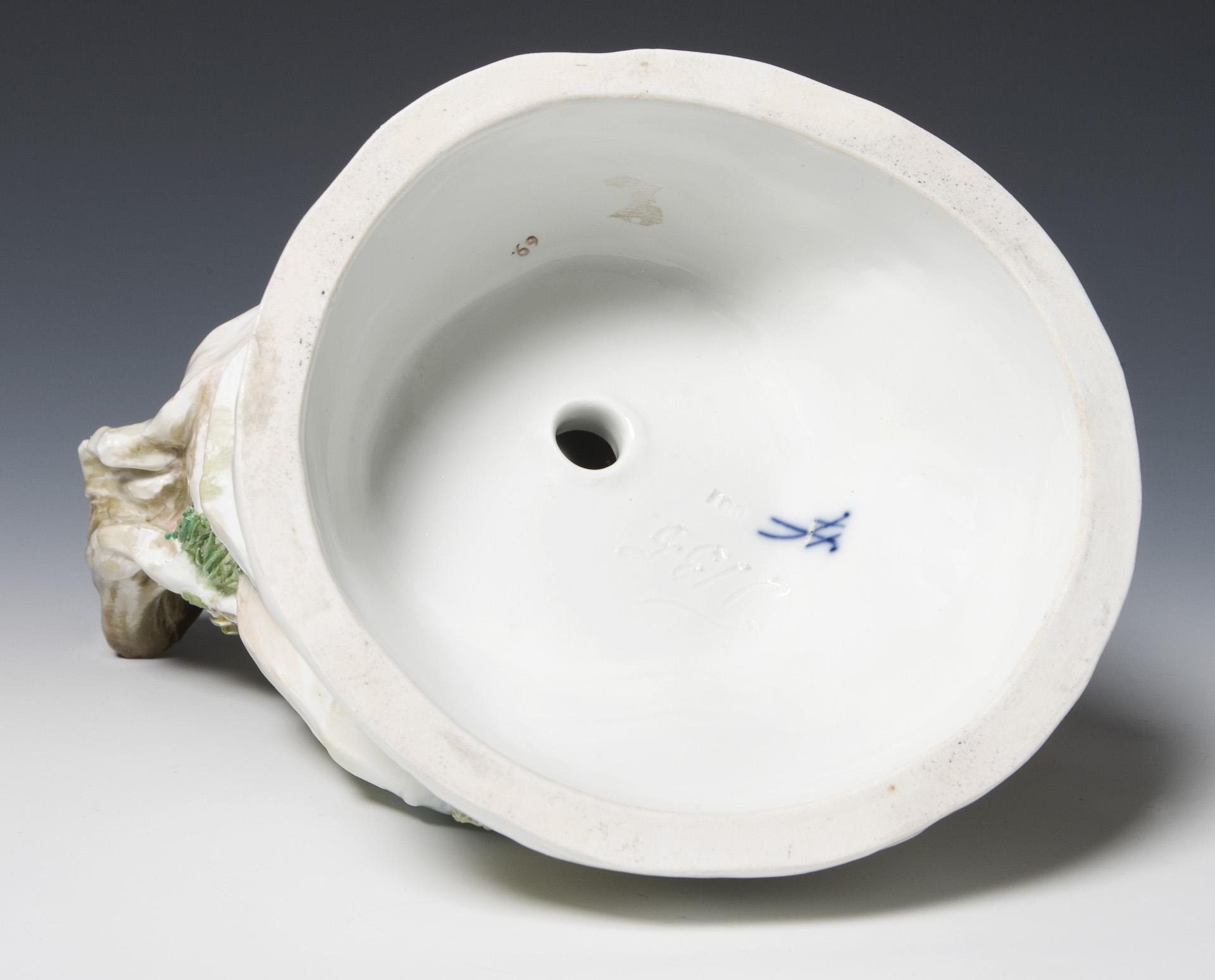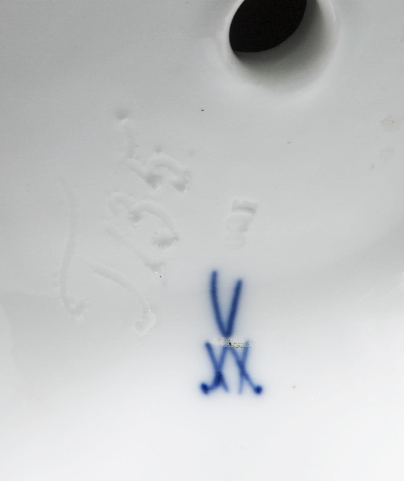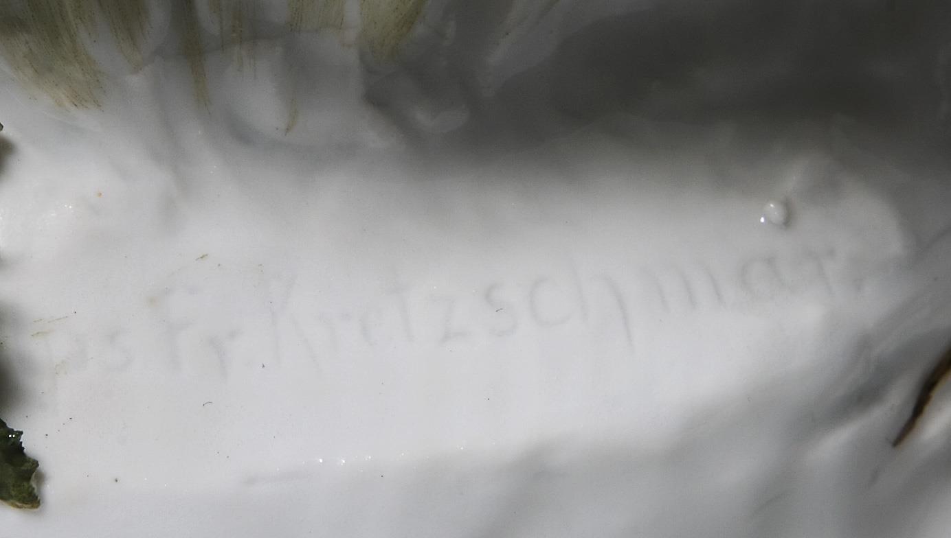 Fein modelliert, naturalistisch bemalt. Ritzmarke, Pressmarke, Malermarke, Schwertermarke einmal gestrichen, Künstler-Signet. Ein Zeh, wenige Blätter restauriert, einige Blätter bestoßen.