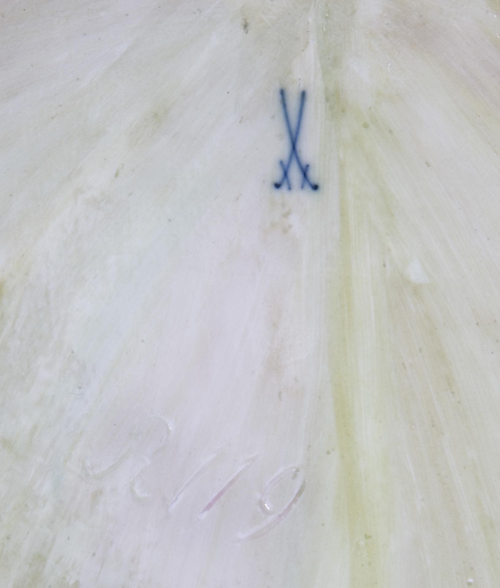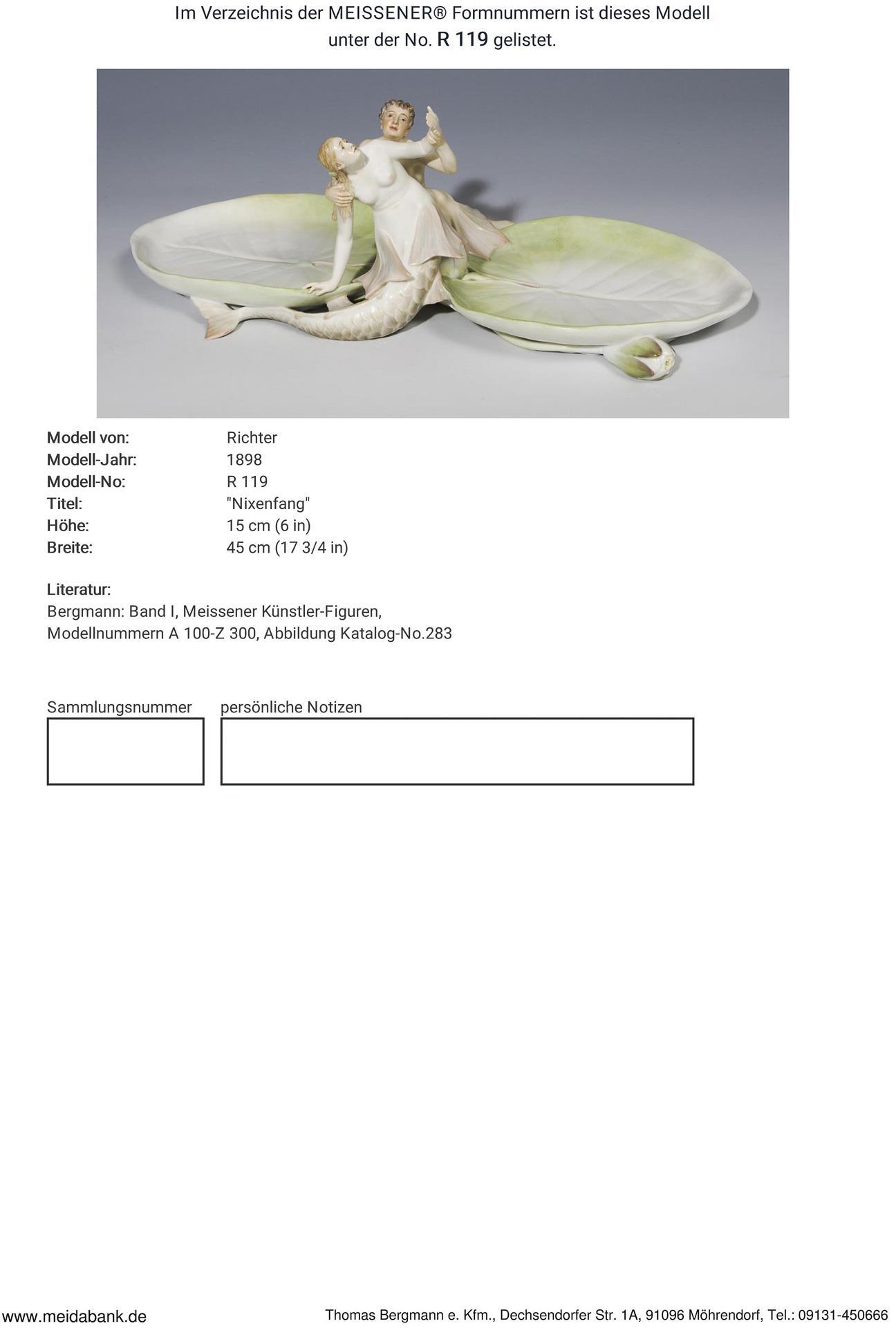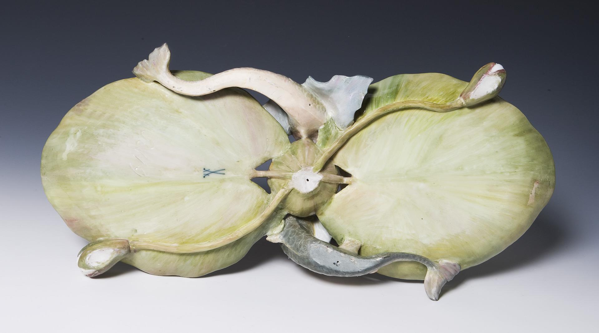 Modell von Richter (Lebensdaten unbekannt). Naturalistisch bemalt. Nix und Nixe, der Wassergeist und die Meerjungfrau sind zwischen großen Seerosenblättern zentral als Liebespaar empor gehoben. Ritzmarke, Schwertermarke