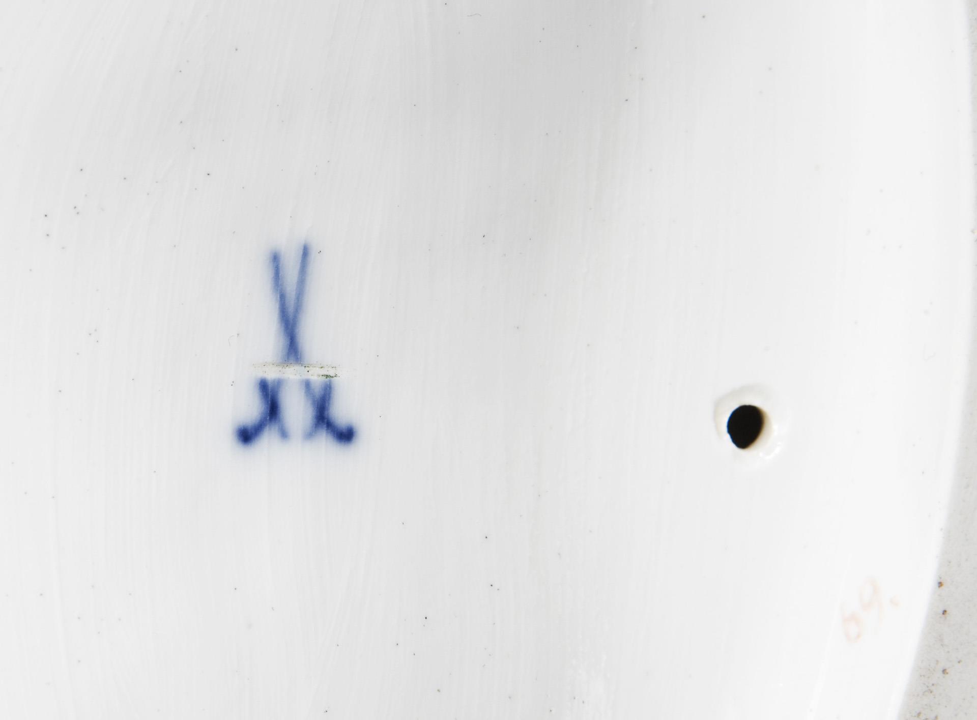 Farbig bemalt. Ritzmarke, Malermarke, Schwertermarke einmal gestrichen. Unterarme der Nixe, Tritonkörper, Schilf fachmännisch restauriert.