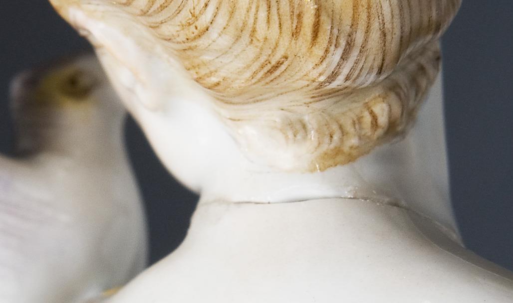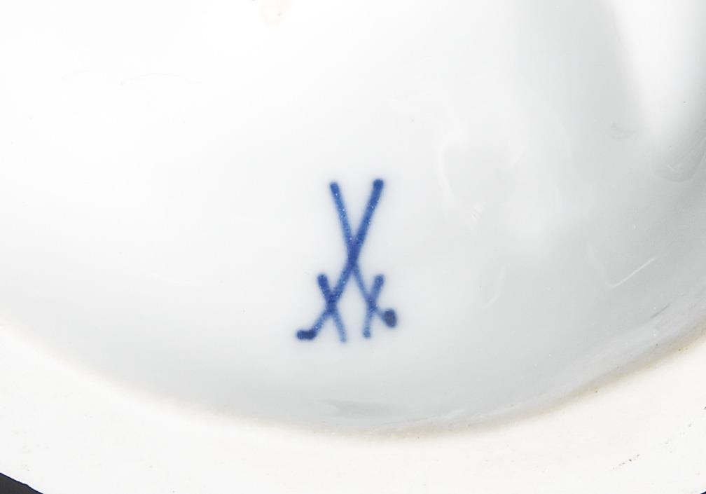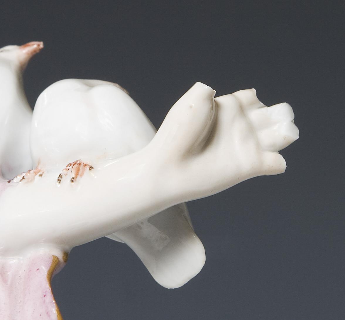 Farbig bemalt, gold staffiert. Ritzmarke, Pressmarke, Malermarke, Schwertermarke. Finger einer Hand, eine Flügelspitze minimal bestoßen, Kopf, ein Flügel geklebt.