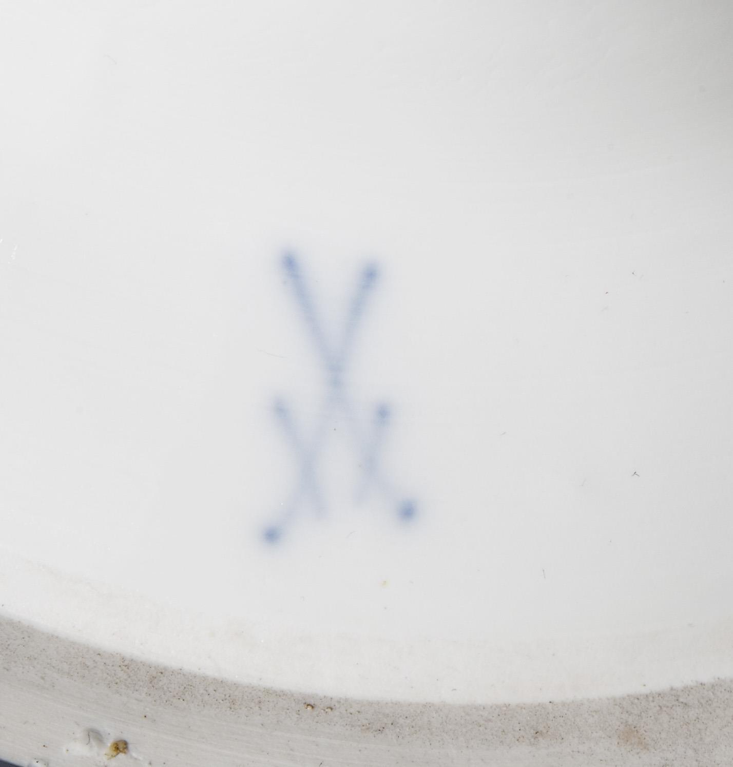 Pendant zu Modell-Nr. N 146 "Fischer mit Netz". Farbig bemalt, gold staffiert, aufwendig gearbeiteter Sockel mit Wellenband, reliefierten Delphinen, Schilf und Dreizack. Ritzmarke, Pressmarke, Malermarke, Schwertermarke. Blätter bestoßen, hinterer Pantoffel (der am Fuß) restauriert.