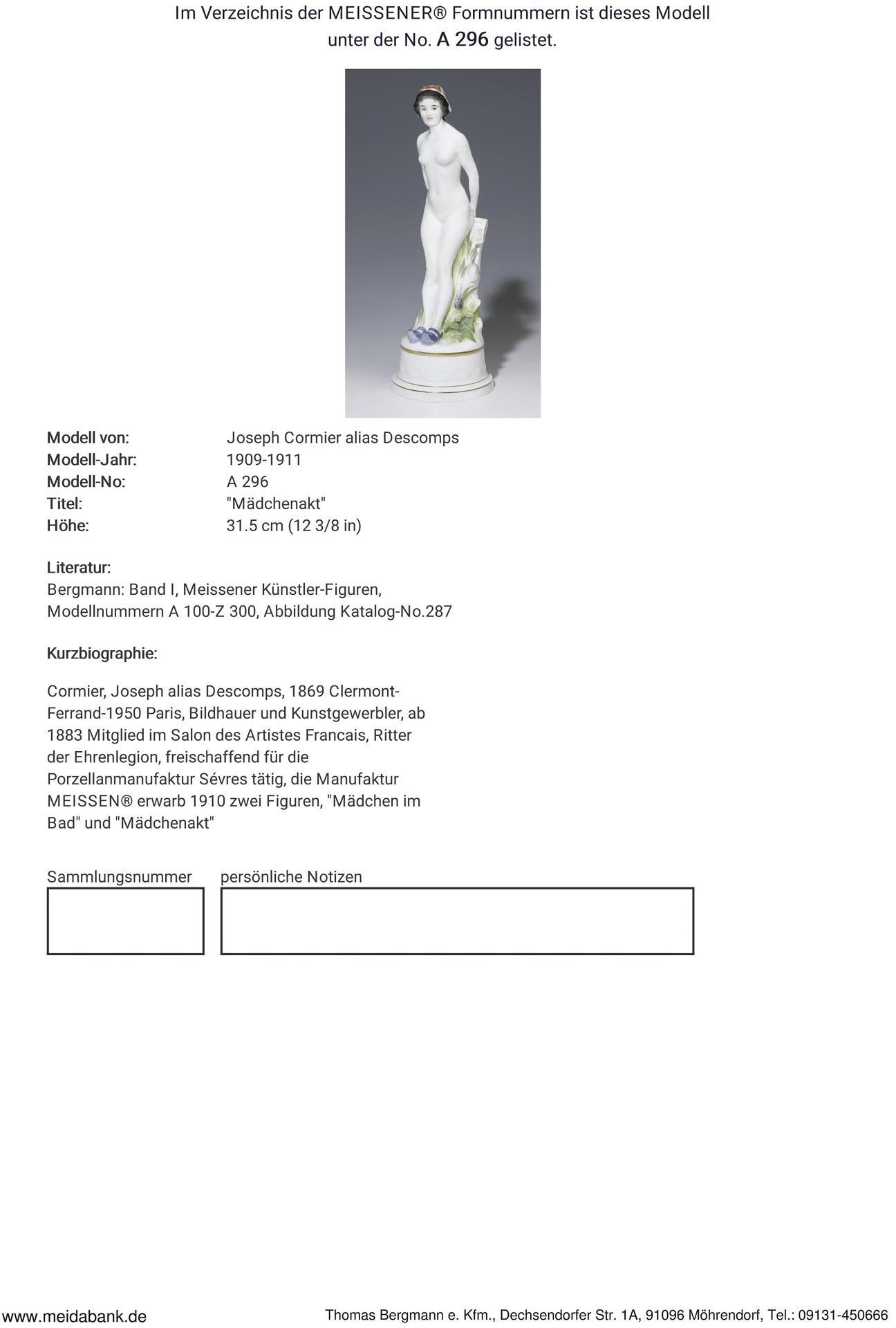 Ausformung 1909-1923. Modell-Jahr: 1909-1911, Modell-Nr. A 296. Modell von. CORMIER, Joseph, alias Descomps(1869 Clermont-Ferrand - 1950 Paris)