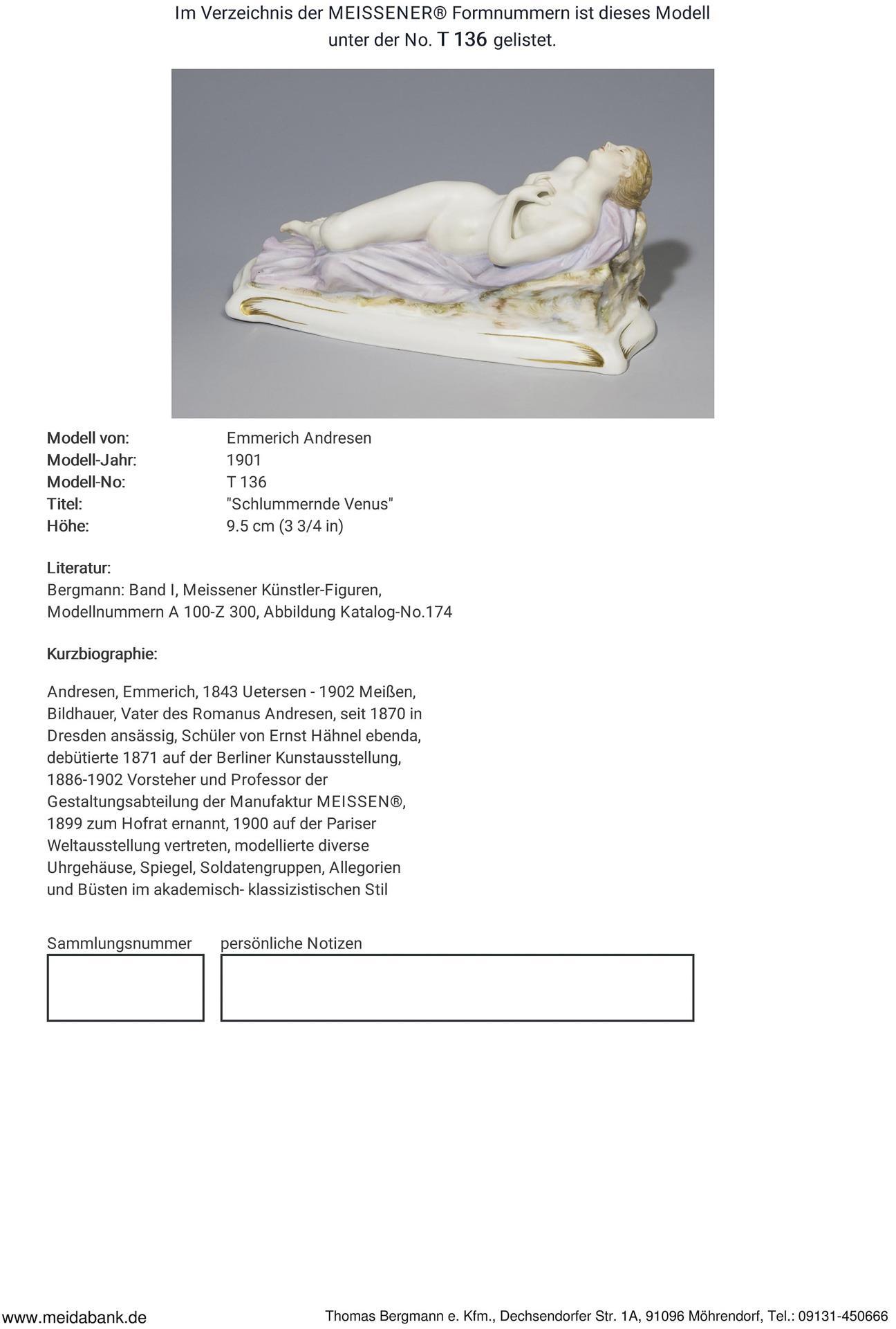 Ausformung 1901-1923. Modell-Jahr: 1901, Modell-Nr. T 136. Modell von. ANDRESEN, Emmerich(1843 Uetersen - 1902 Meißen)
