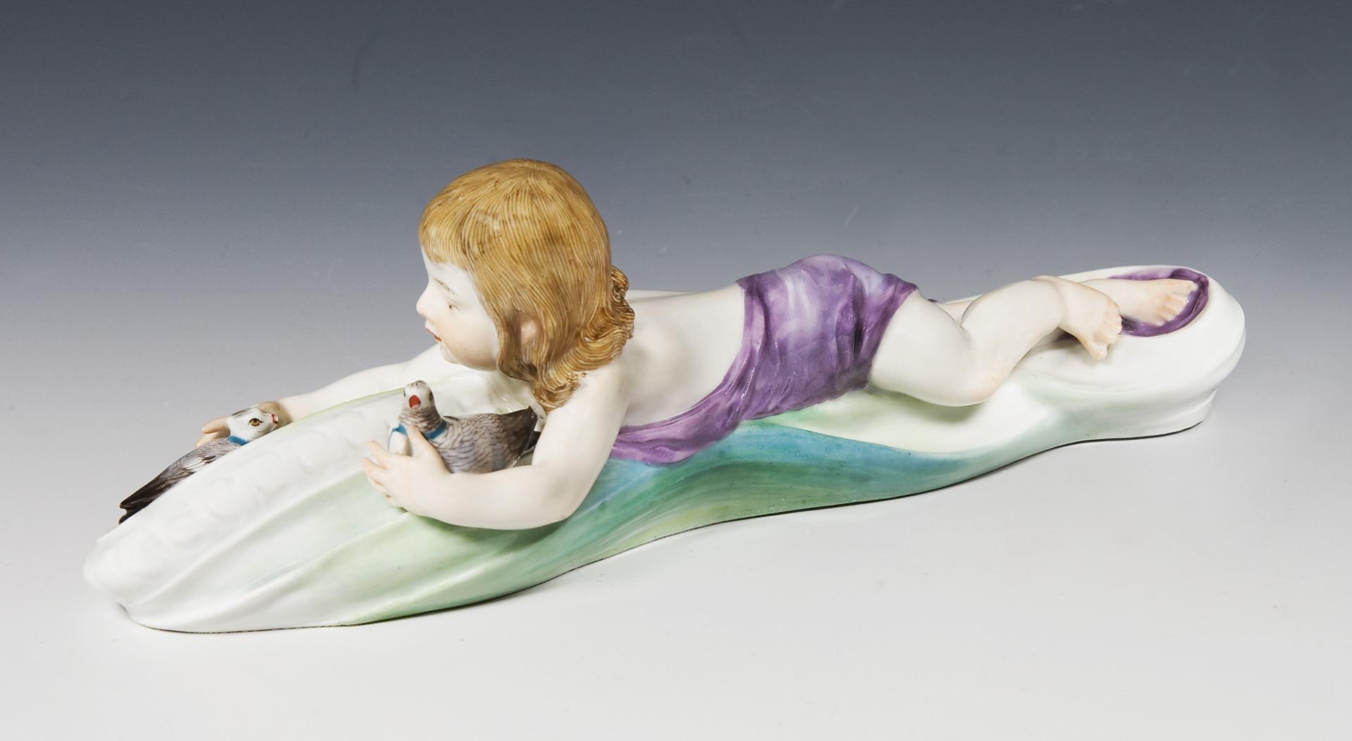 Seltene Figur: Kind mit Brieftauben. Meissen.
