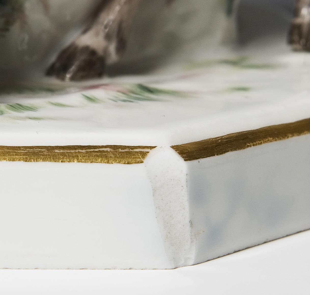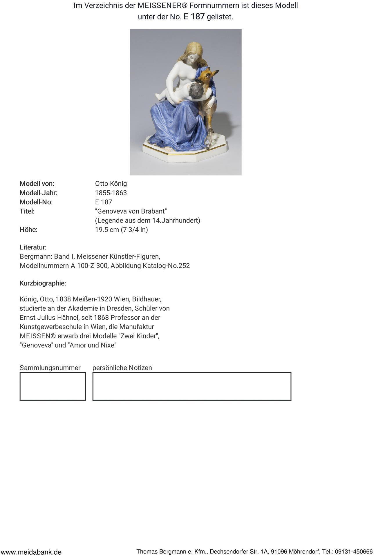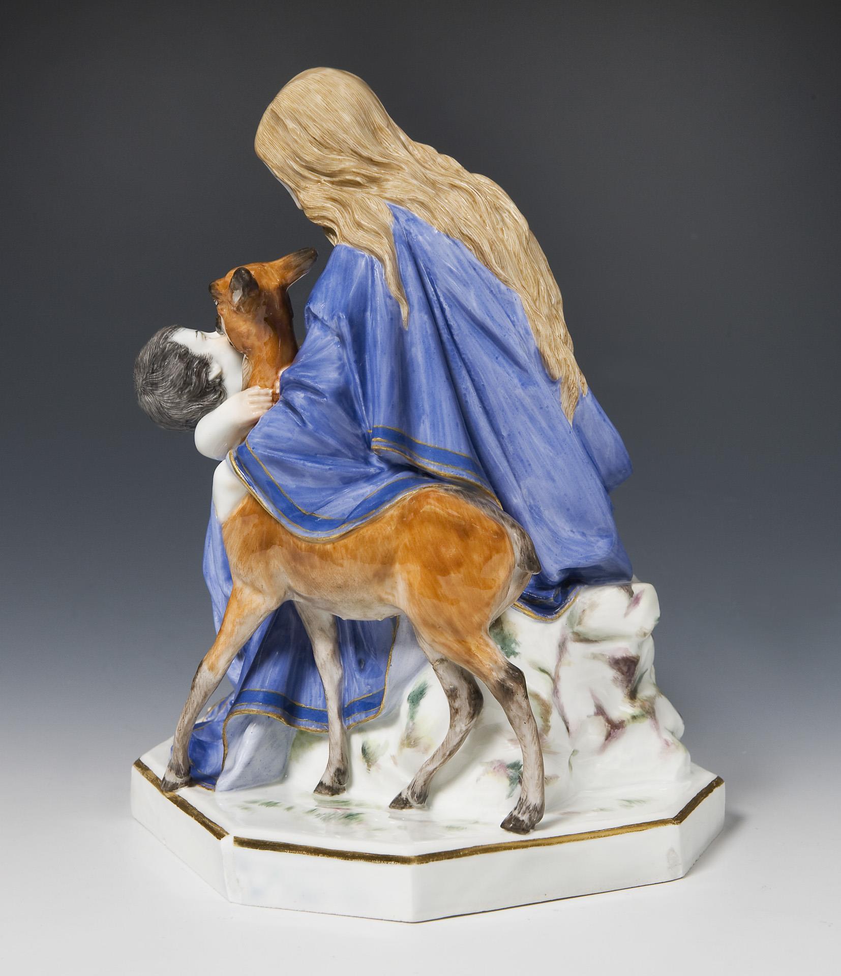 Farbig bemalt, gold staffiert. Ritzmarke, Pressmarke, Malermarke, Schwertermarke einmal gestrichen. Figur einer Legende aus dem 14. Jahrhundert. Der Untreue bezichtigt konnte sie vor der geplanten Hinrichtung in den Wald von der Ardennen fliehen. Sie und ihr dort geborener Sohn wurden von einer Hirschkuh ernährt, bis nach Jahren ihr Mann sie auf einer Jagd wiederfand. Er hatte inzwischen ihre Unschuld erkannt und führte sie in Ehren zurück. Sockel partiell bestoßen.