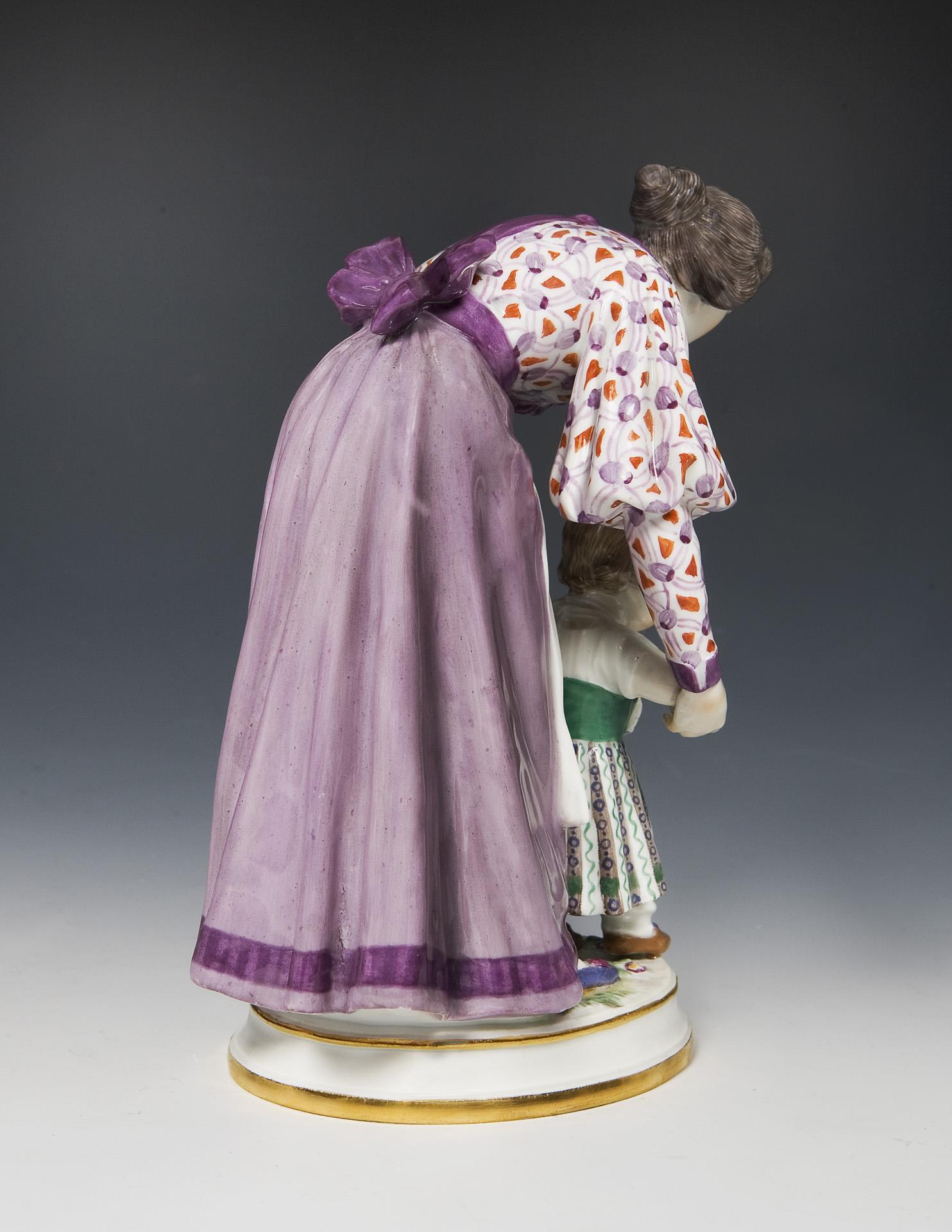 Farbig bemalt, gold staffiert. Sockelfront mit floralem Relief. Ritzmarke, Pressmarke, Malermarke, Schwertermarke. Rückseitig Kleid von unten minimal bestoßen, kleiner Brandriss.