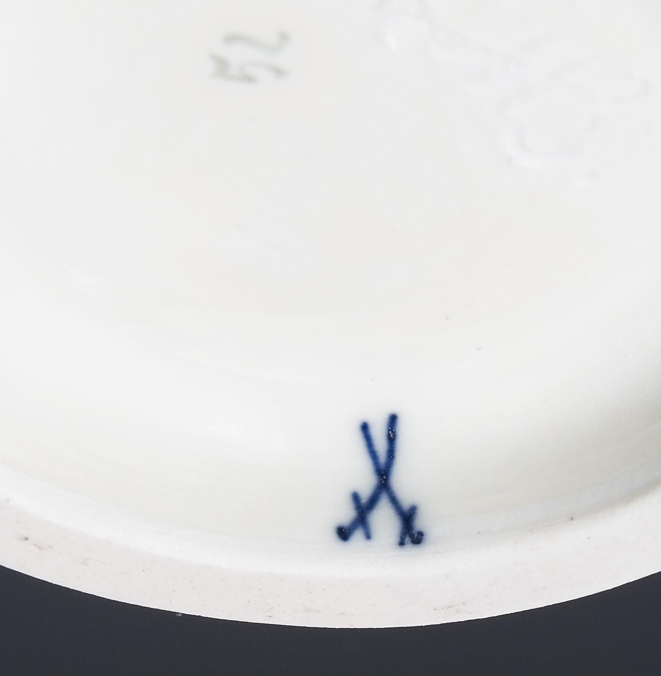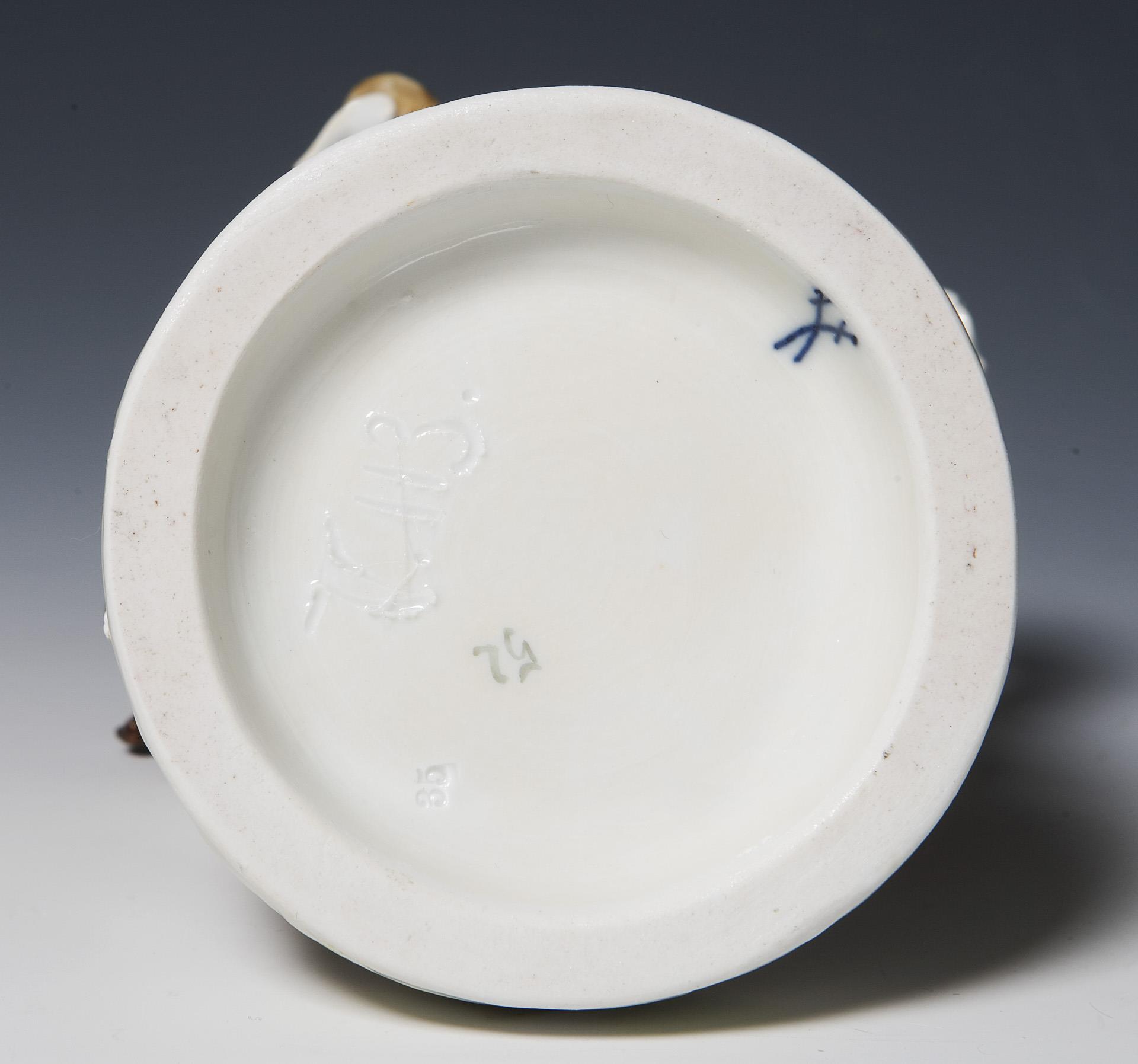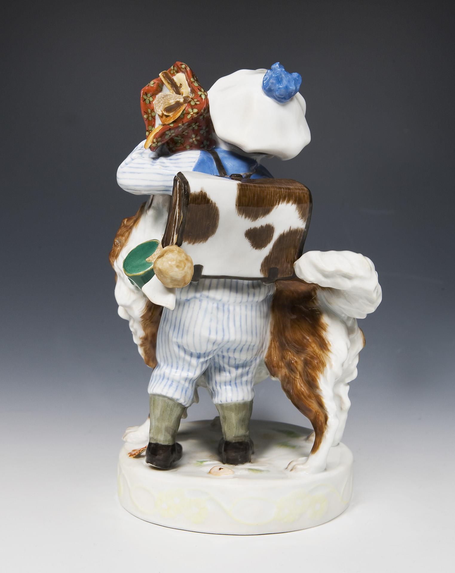 Farbig bemalt, detailreich modelliert, Sockelwandung floral reliefiert. Ritzmarke, Pressmarke, Malermarke, Schwertermarke. Rückseitig Tuch am Ranzen restauriert.