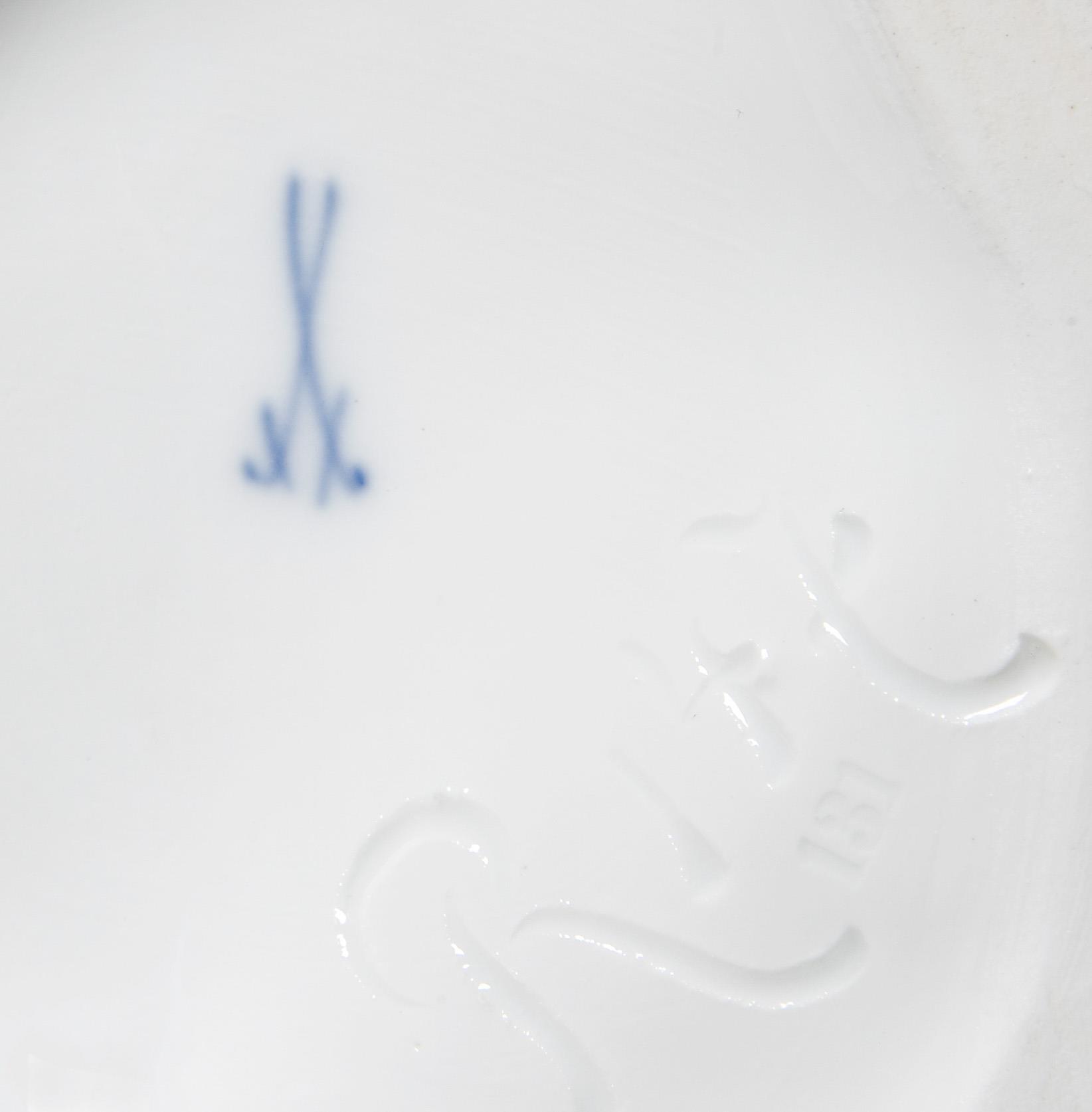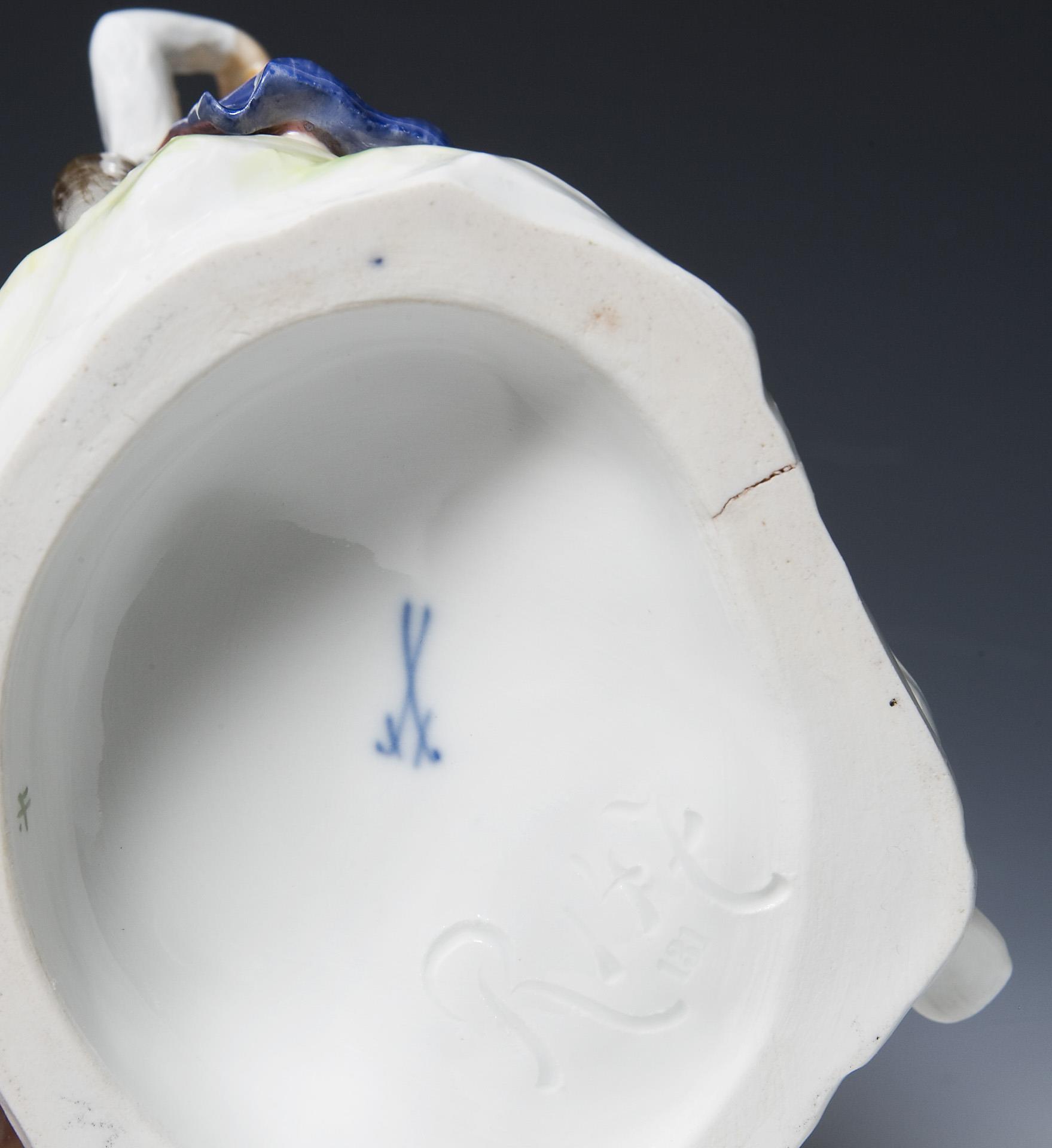 Figurengruppe mit anekdotischen Zügen, farbig bemalt. Ritzmarke, Pressmarke, Malermarke, Schwertermarke. Unbedeutender kleiner Brandriss am Sockelrand.