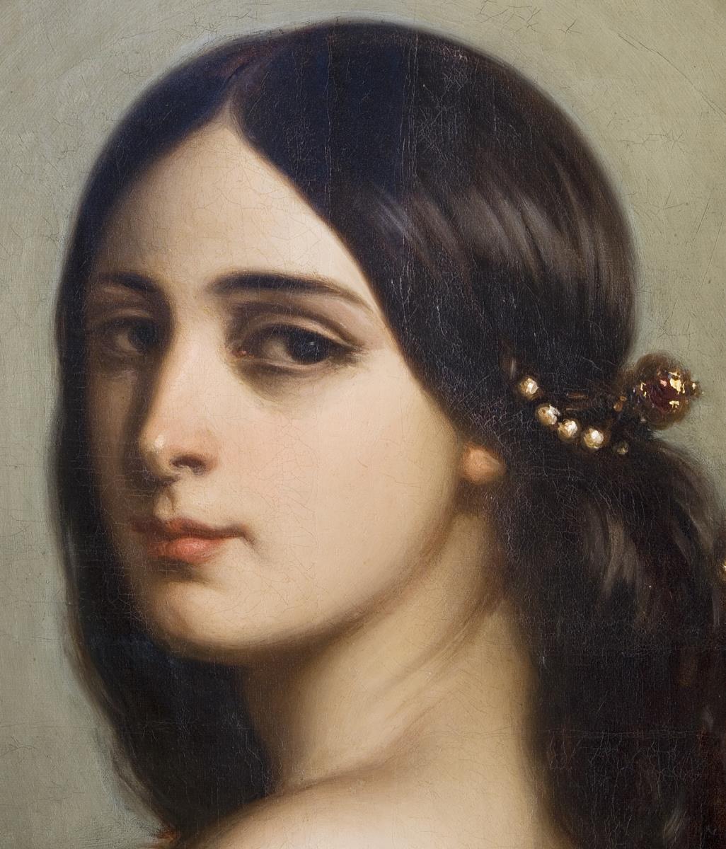 Fein gemaltes Charakterbildnis im Halbprofil. Die hübsche Dame ist mit anmutig malerischen, fast erotischen Schmelz dargestellt. Originaler Keilrahmen, originaler vergoldeter Stuckrahmen. Partiell Craquelé.