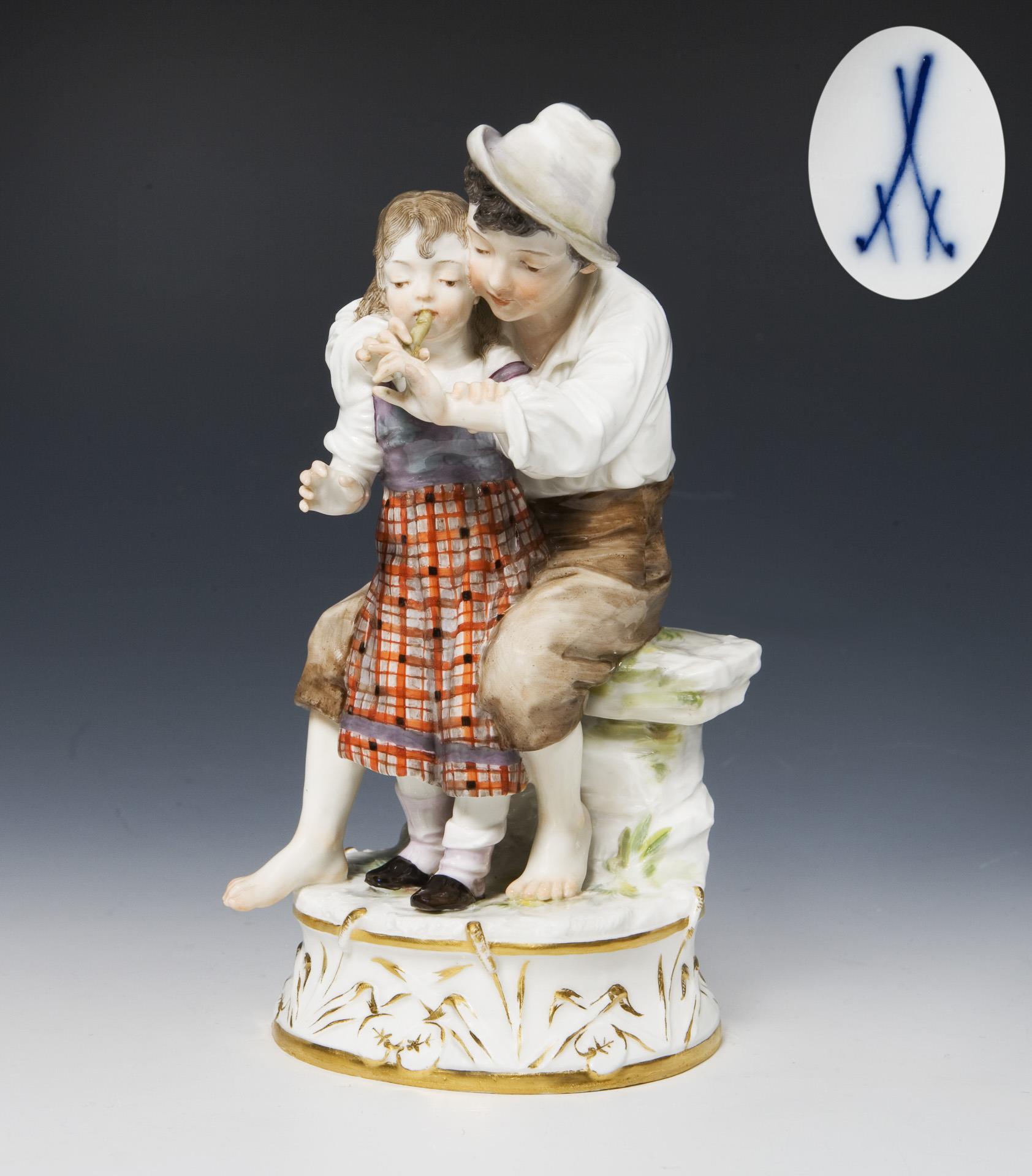 Farbig bemalt, gold staffiert, detailreich modelliert, Sockelwandung reliefiert. Ritzmarke, Pressmarke, Malermarke, Schwertermarke. Ein Finger, Flöte, Sockelrand minimal bestoßen.